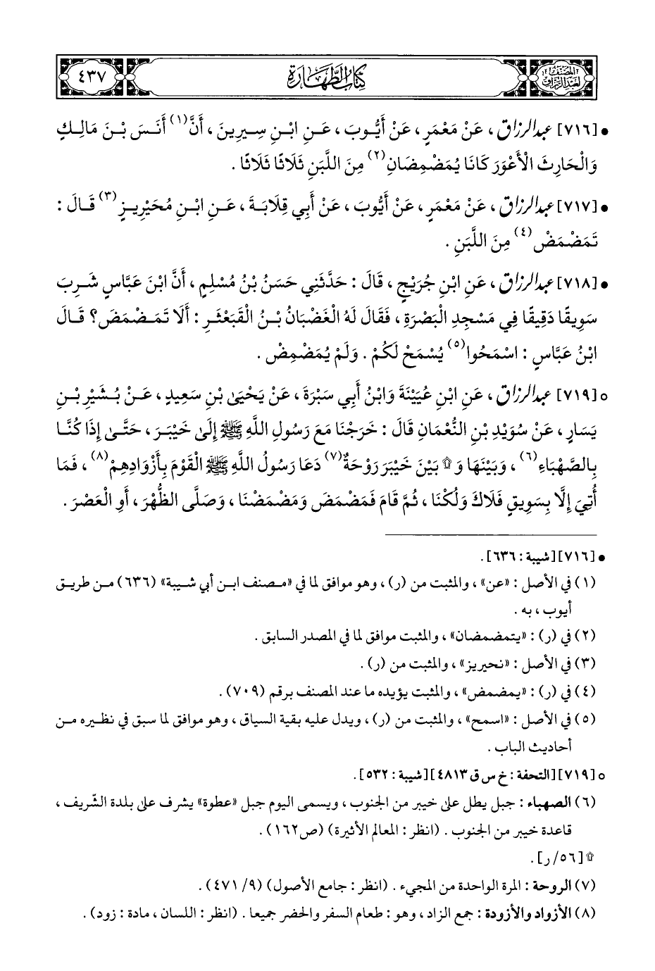 ° [٧١٩] عبد الرزاق، عَنِ ابْنِ عُيَيْنَةَ وَابْنُ أَبِي سَبْرَةَ، عَنْ يَحْيَى بْنِ سَعِيدٍ، عَنْ بُشَيْرِ بْنِ يَسَارٍ، عَنْ سُوَيْدِ بْنِ النُّعْمَانِ قَالَ: خَرَجْنَا مَعَ رَسُولِ اللَّهِ - صلى الله عليه وسلم - إِلَى خَيْبَرَ، حَتَّى إِذَا كُنَّا بالصَّهْبَاءِ (¬٦)، وَبَينَهَا وَ * بَيْنَ خَيْبَرَ رَوْحَةٌ (¬٧) دَعَا رَسُولُ اللهِ - صلى الله عليه وسلم - الْقَوْمَ بأَزْوَادِهِمْ (¬٨)، فَمَا أُتيَ إِلَّا بِسَوِيقٍ فَلَاكَ وَلُكْنَا، ثُمَّ قَامَ فَمَضْمَضَ وَمَضْمَضْنَا، وَصَلَّى الظُّهْرَ، أَوِ الْعَصْرَ.