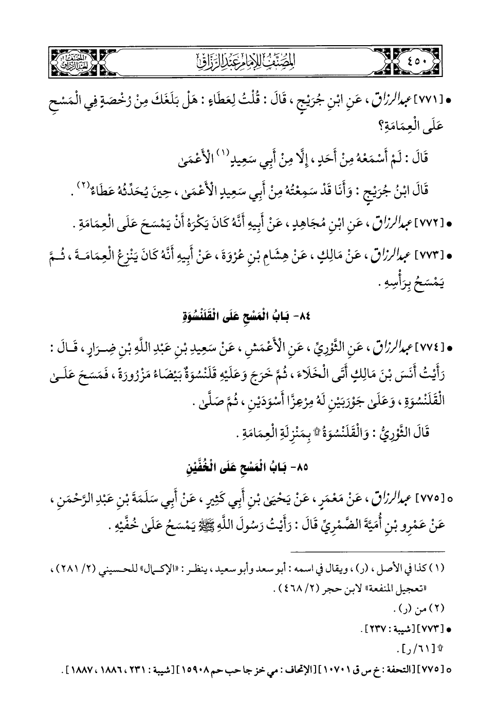 • [٧٧١] عبد الرزاق، عَنِ ابْنِ جُرَيْجٍ، قَالَ: قُلْتُ لِعَطَاءٍ: هَلْ بَلَغَكَ مِنْ رُخْصةٍ فِي الْمَسْحِ عَلَى الْعِمَامَةِ؟