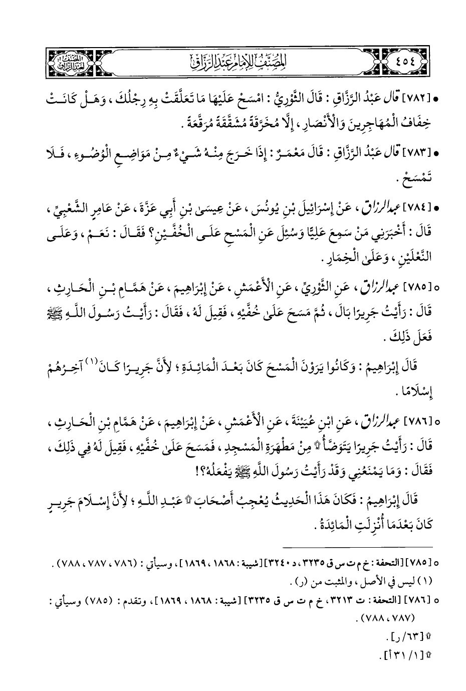 ° [٧٨٥] عبد الرزاق، عَنِ الثَّوْرِيِّ، عَنِ الْأَعْمَشِ، عَنْ إِبْرَاهِيمَ، عَنْ هَمَّامِ بْنِ الْحَارِثِ، قَالَ: رَأَيْتُ جَرِيرًا بَالَ، ثُمَّ مَسَحَ عَلَى خُفَّيْهِ، فَقِيلَ لَهُ، فَقَالَ: رَأَيْتُ رَسُولَ اللَّهِ - صلى الله عليه وسلم - فَعَلَ ذَلِكَ.