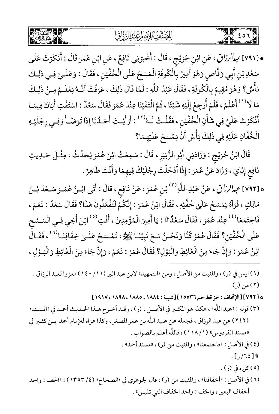 ° [٧٩٢] عبد الرزاق، عَنْ عَبْدِ اللَّهِ (¬٣) بْنِ عُمَرَ، عَنْ نَافِعٍ، قَالَ: أَتَى ابْنُ عُمَرَ سَعْدَ بْنَ مَالِكٍ، فَرَآهُ يَمْسَحُ عَلَى خُفَّيْهِ، فَقَالَ ابْنُ عُمَرَ: إِنَّكُمْ لَتَفْعَلُونَ هَذَا؟ فَقَالَ سَعْدٌ: نَعَمْ، فَاجْتَمَعَا (¬٤) عَنْدَ عُمَرَ، فَقَالَ سَعْدٌ *: يَا أَمِيرَ الْمُؤْمِنِينَ، أَفْتِ (¬٥) ابْنَ أَخِي فِي الْمَسْحِ عَلَى الْخُفَّيْنِ؟ فَقَالَ عُمَرُ كُنَّا وَنَحْنُ مَعَ نَبِيِّنَا - صلى الله عليه وسلم -، نَمْسَحُ عَلَى خِفَافِنَا (¬٦)، فَقَالَ ابْنُ عُمَرَ: وَإِنْ جَاءَ مِنَ الْغَائِطِ وَالْبَوْلِ؟ فَقَالَ عُمَرُ: نَعَمْ، وإِنْ جَاءَ مِنَ الْغَائِطِ وَالْبَوْلِ،