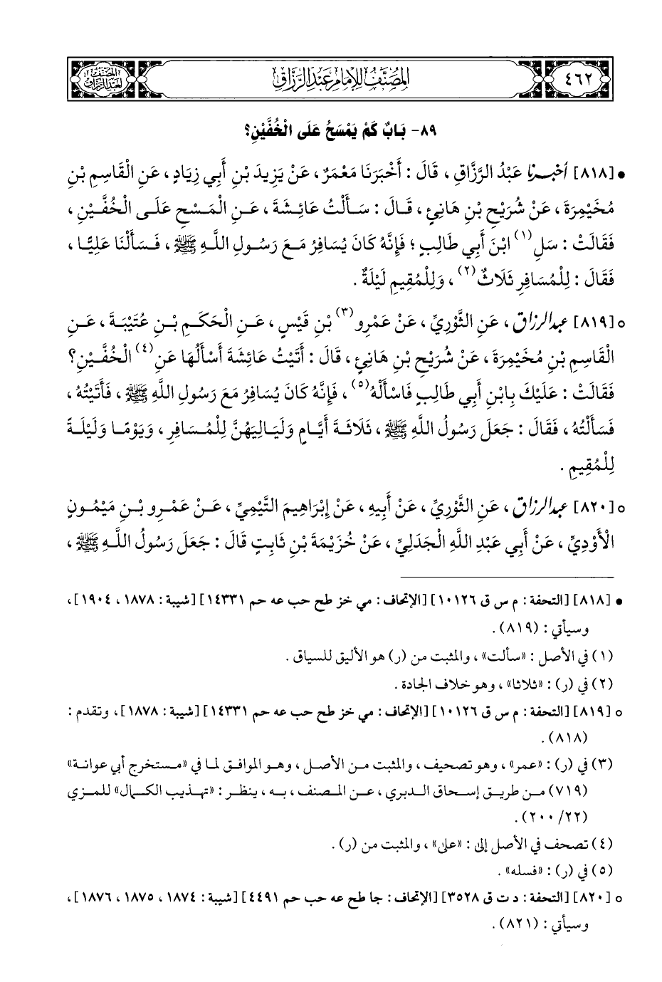 ° [٨١٩] عبد الرزاق، عَنِ الثَّوْرِيِّ، عَنْ عَمْرِو (¬٣) بْنِ قَيْسٍ، عَنِ الْحَكَمِ بْنِ عُتَيْبَةَ، عَنِ الْقَاسِمِ بْنِ مُخَيْمِرَةَ، عَنْ شُرَيْحِ بْنِ هَانِئٍ، قَالَ: أَتَيْتُ عَائِشَةَ أَسْأَلُهَا عَنِ (¬٤) الْخُفَّيْنِ؟ فَقَالَتْ: عَلَيْكَ بِابْنِ أَبِي طَالِبٍ فَاسْأَلْهُ (¬٥)، فَإِنَّهُ كَانَ يُسَافِرُ مَعَ رَسُولِ اللَّهِ - صلى الله عليه وسلم -، فَأَتَيْتُهُ، فَسَأَلْتُهُ، فَقَالَ: جَعَلَ رَسُولُ اللَّهِ - صلى الله عليه وسلم -، ثَلَاثَةَ أَيَّامٍ وَلَيَالِيَهُنَّ لِلْمُسَافِرِ، وَيَوْمًا وَلَيْلَةً لِلْمُقِيمِ.
