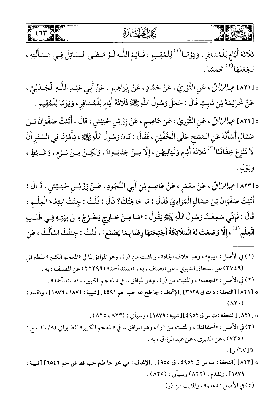 ° [٨٢١] عبد الرزاق، عَنِ الثَّوْريِّ، عَنْ حَمَّادٍ، عَنْ إِبْرَاهِيمَ، عَنْ أَبِي عَبْدِ اللَّهِ الْجَدَلِيِّ، عَنْ خُزَيْمَةَ بْنِ ثَابِتٍ قَالَ: جَعَلَ رَسُولُ اللَّهِ - صلى الله عليه وسلم - ثَلَاثَةَ أَيَّامٍ لِلْمُسَافِرِ، وَيَوْمًا لِلْمُقِيمِ.