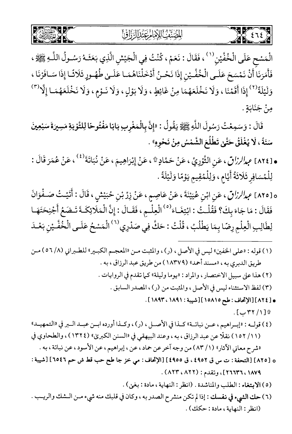 • [٨٢٤] عبد الرزاق، عَنِ الثَّوْريِّ، عَنْ حَمَّادٍ *، عَنْ إِبْرَاهِيمَ، عَنْ نُبَاتَةَ (¬٤)، عَنْ عُمَرَ قَالَ: لِلْمُسَافِرِ ثَلَاثَةُ أَيَّامٍ، وَلِلْمُقِيمِ يَوْمًا وَلَيْلَةً.