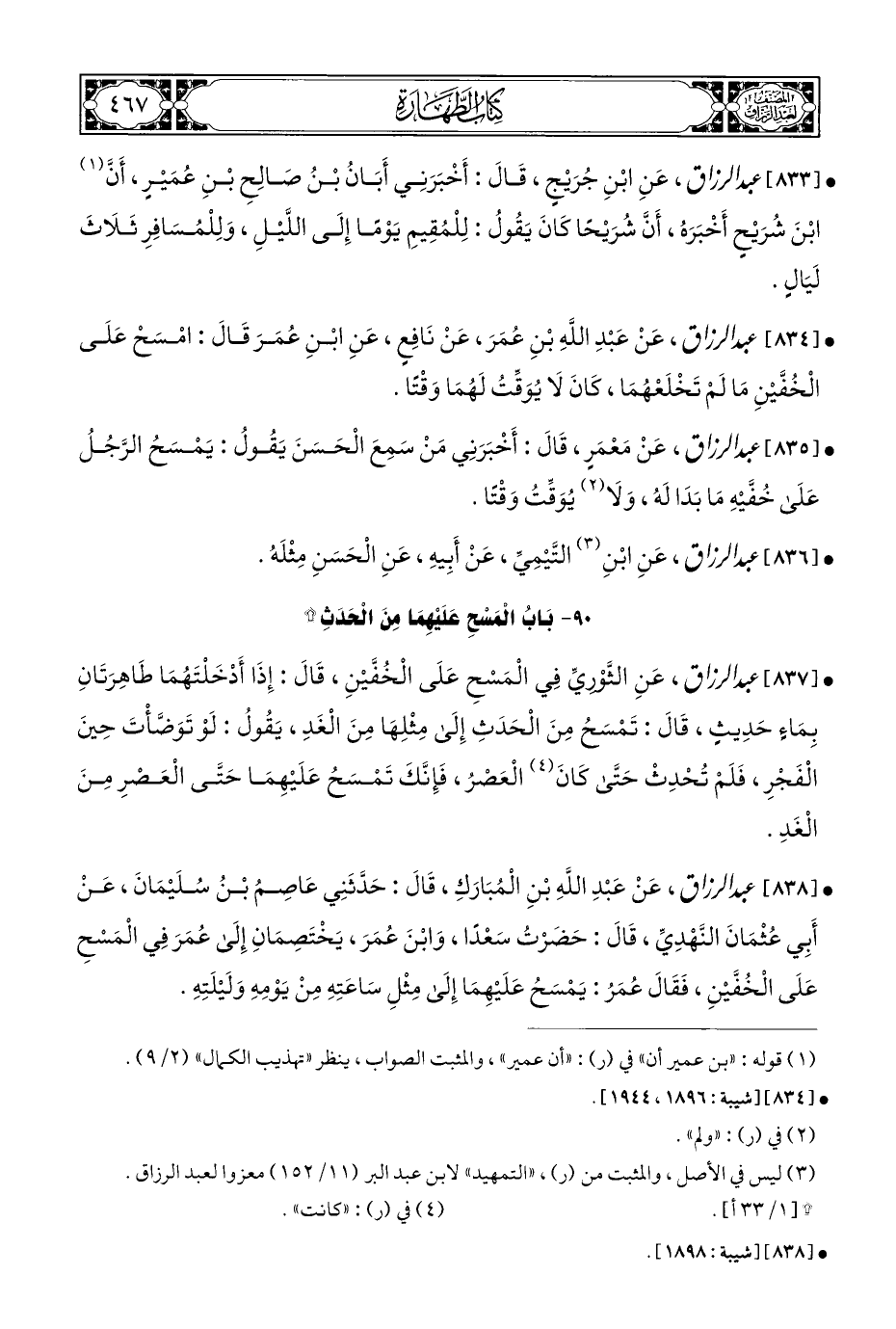 • [٨٣٨] عبد الرزاق، عَنْ عَبْدِ اللَّهِ بْنِ الْمُبَارَكِ، قَالَ: حَدَّثَنِي عَاصِمُ بْنُ سُلَيْمَانَ، عَنْ أَبِي عُثْمَانَ النَّهْدِيِّ، قَالَ: حَضرْتُ سَعْدًا، وَابْنَ عُمَرَ، يَخْتَصِمَانِ إِلَى عُمَرَ فِي الْمَسْحِ عَلَى الْخُفَّيْنِ، فَقَالَ عُمَرُ: يَمْسَحُ عَلَيْهِمَا إِلَى مِثْلِ سَاعَتِهِ مِنْ يَوْمِهِ وَلَيْلَتِهِ.