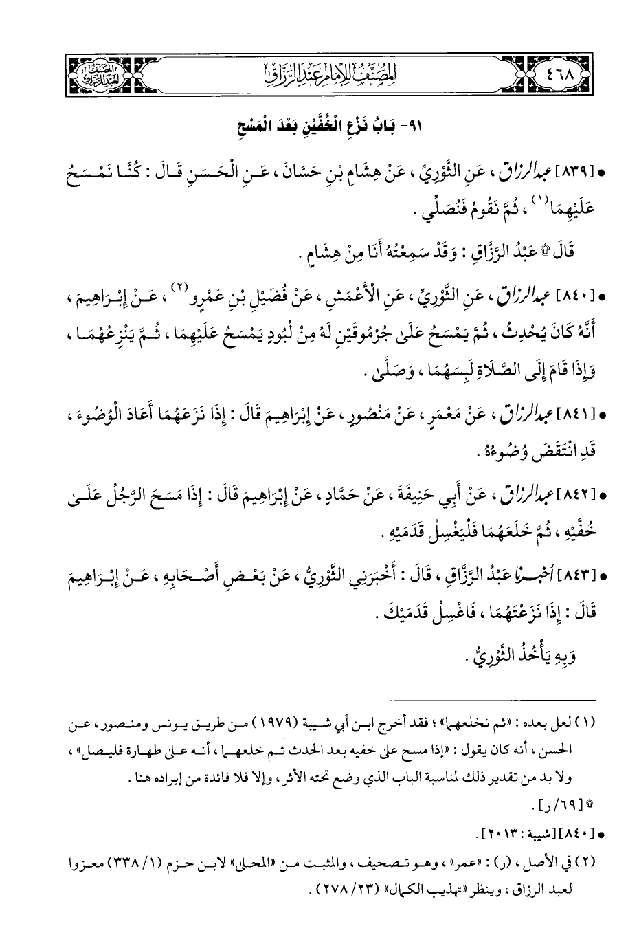 • [٨٣٩] عبد الرزاق، عَنِ الثَّوْريِّ، عَنْ هِشَامِ بْنِ حَشَانَ، عَنِ الْحَسَنِ قَالَ: كُنَّا نَمْسَحُ عليهما (¬١)، ثُمَّ نَقُومُ فَنُصَلِّي.