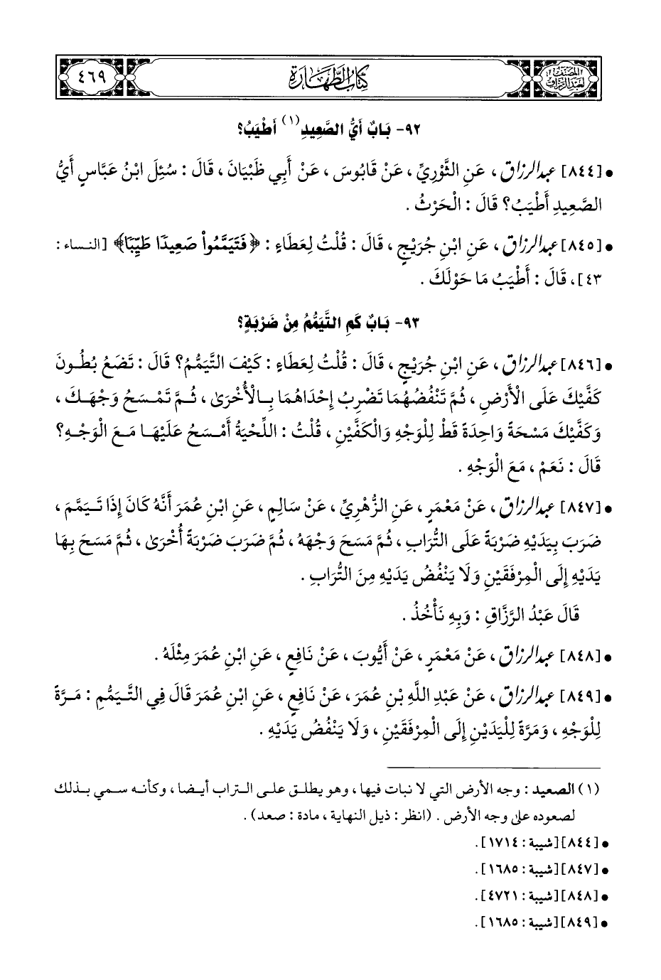 • [٨٤٥] عبد الرزاق، عَنِ ابْنِ جُرَيْجٍ، قَالَ: قُلْتُ لِعَطَاءٍ: {فَتَيَمَّمُوا صَعِيدًا طَيِّبًا} [النساء: ٤٣]، قَالَ: أَطْيَبُ مَا حَوْلَكَ.