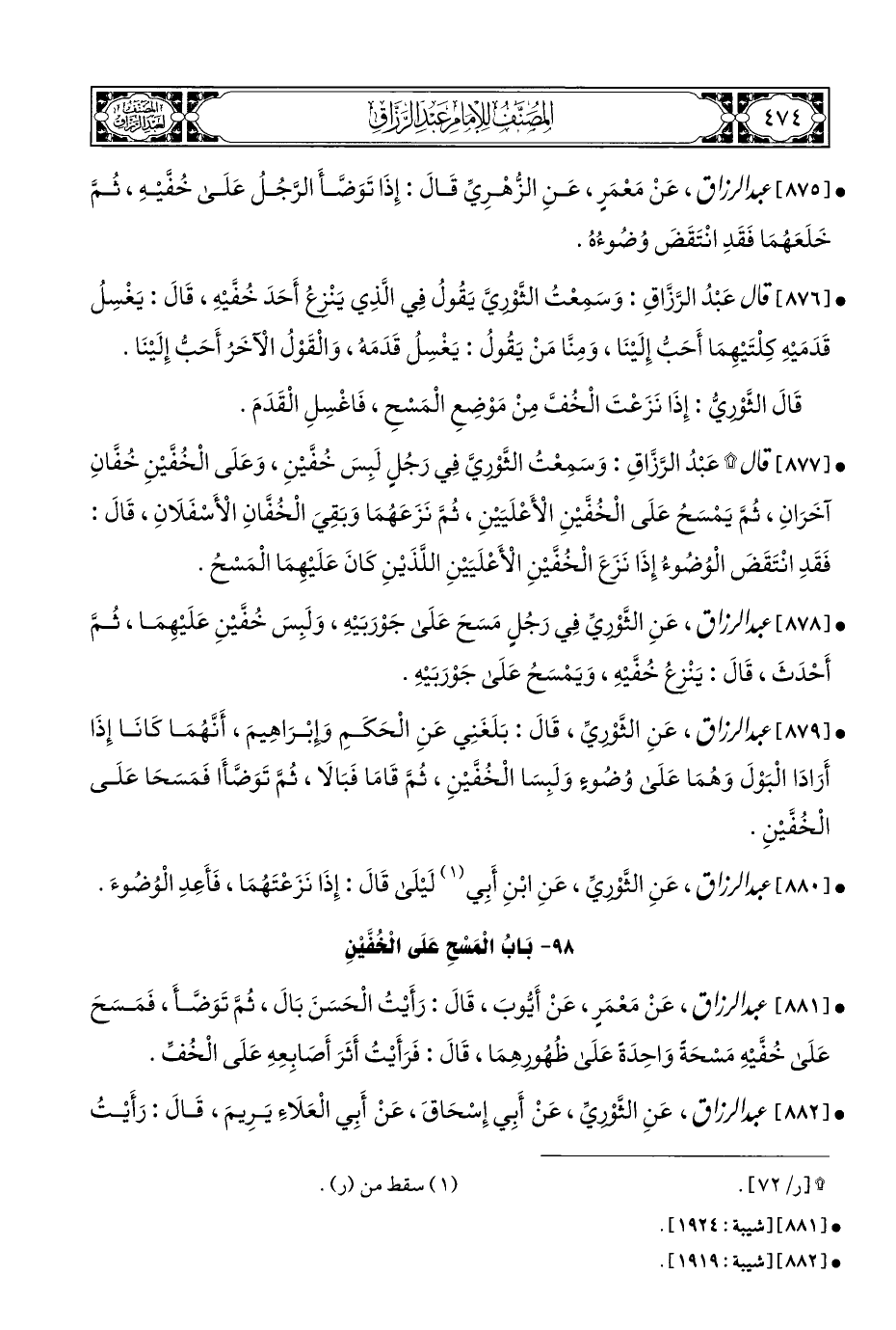 • [٨٨٠] عبد الرزاق، عَنِ الثَّوْريِّ، عَنِ ابْنِ أَبِي (¬١) لَيْلَى قَالَ: إِذَا نَزَعْتَهُمَا، فَأَعِدِ الْوُضُوءَ.