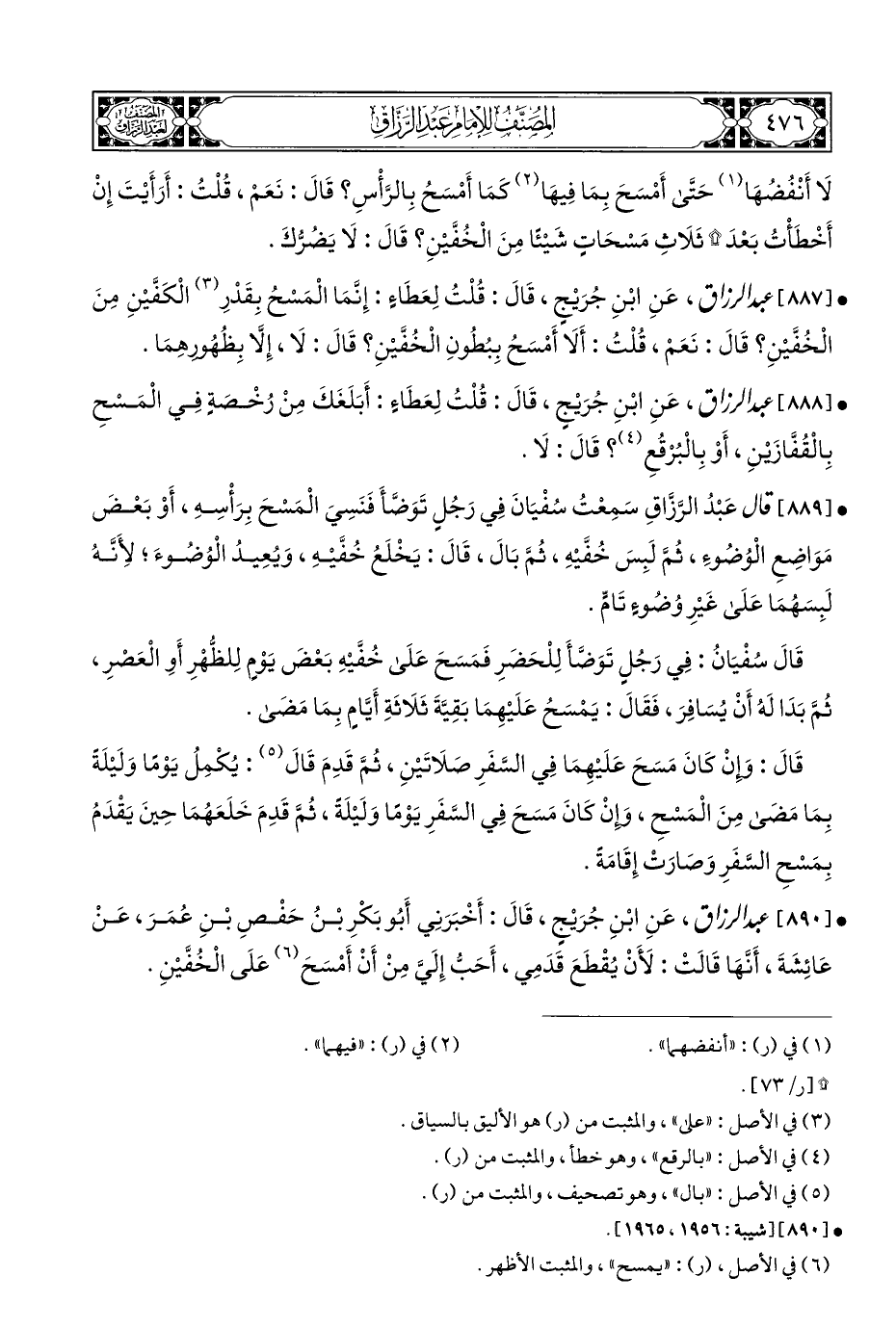 • [٨٨٧] عبد الرزاق، عَنِ ابْنِ جُرَيْجٍ، قَالَ: قُلْتُ لِعَطَاءٍ: إِنَّمَا الْمَسْحُ بِقَدْرِ (¬٣) الْكَفَّيْنِ مِنَ الْخُفَّيْنِ؟ قَالَ: نَعَمْ، قُلْتُ: أَلَا أَمْسَحُ بِبُطُونِ الْخُفَّيْنِ؟ قَالَ: لَا، إِلَّا بِظُهُورِهِمَا.
