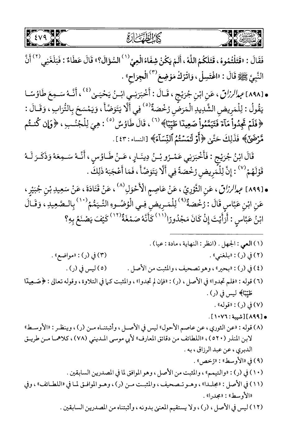 • [٨٩٩] عبد الرزاق، عَنِ الثَّوْريِّ، عَنْ عَاصِمٍ الْأَحْوَلِ (¬٨)، عَنْ قَتَادَةَ، عَنْ سَعِيدِ بْنِ جُبَيْرٍ، عَنِ ابْنِ عَبَّاسٍ قَالَ: رُخْصَةٌ (¬٩) لِلْمَرِيضِ فِي الْوُضُوءَ التَّيَمُّمُ (¬١٠) بِالصَّعِيدِ، وَقَالَ ابْنُ عَبَّاسٍ: أَرَأَيْتَ إِنْ كَانَ مَجْدُورًا (¬١١) كَأَنَّهُ صَمْغَةٌ (¬١٢) كَيْفَ يَصْنَعُ بِهِ؟
