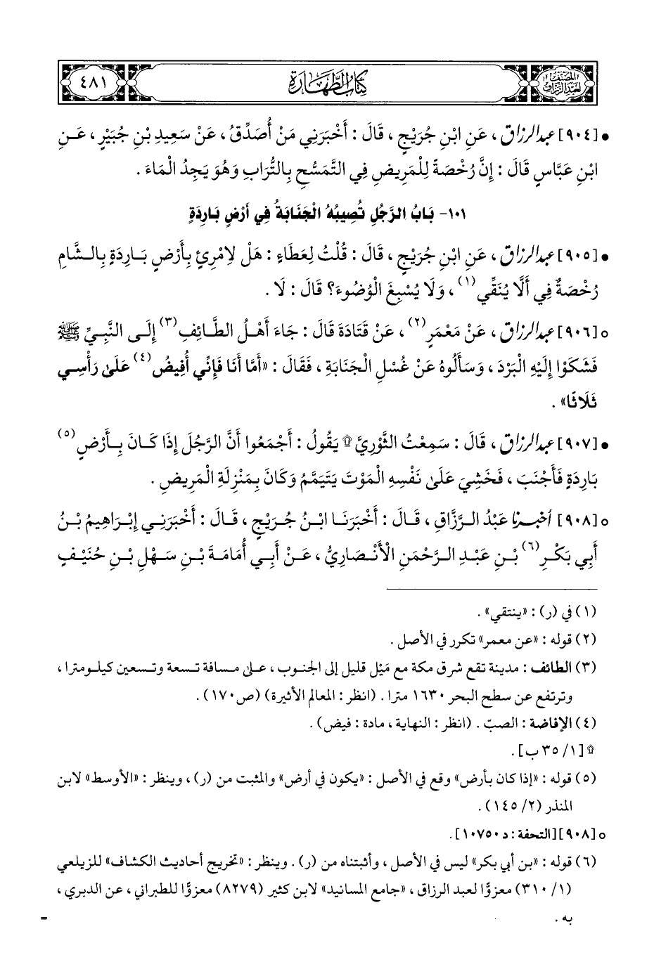 ° [٩٠٦] عبد الرزاق، عَنْ مَعْمَرٍ (¬٢)، عَنْ قَتَادَةَ قَالَ: جَاءَ أَهْلُ الطَّائِفِ (¬٣) إِلَى النَّبِيِّ - صلى الله عليه وسلم - فَشَكَوْا إِلَيْهِ الْبَرْدَ، وَسَأَلُوهُ عَنْ غُسْلِ الْجَنَابَةِ، فَقَالَ: "أَمَّا أَنَا فَإِنِّي أُفِيضُ (¬٤) عَلَى رَأْسِي ثَلَاثًا".