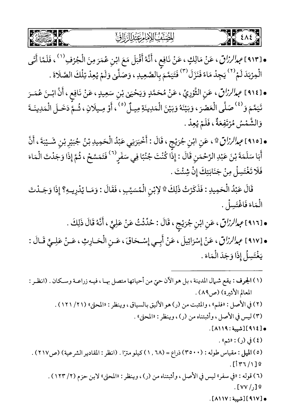• [٩١٣] عبد الرزاق، عَنْ مَالِكٍ، عَنْ نَافِعٍ، أَنَّهُ أَقْبَلَ مَعَ ابْنِ عُمَرَ مِنَ الْجُرُفِ (¬١)، فَلَمَّا أَتَى الْمِرْبَدَ لَمْ (¬٢) يَجِدْ مَاءً فَنَزَلَ (¬٣) فَتَيَمَّمَ بِالصَّعِيدِ، وَصَلَّى وَلَمْ يُعِدْ تِلْكَ الصَّلَاةَ.