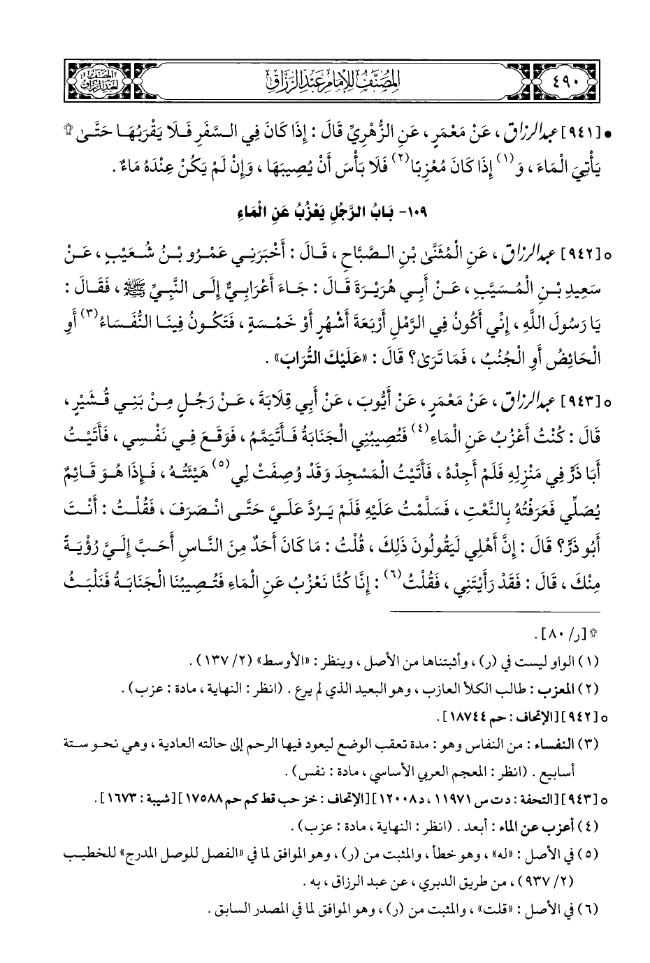 • [٩٤١] عَنْ مَعْمَرٍ، عَنِ الزُّهْرِيِّ قَالَ: إِذَا كَانَ فِي السَّفَرِ فَلَا يَقْرَبُهَا حَتَّى * يَأْتِيَ الْمَاءَ، وَ (¬١) إِذَا كَانَ مُعْزِبًا (¬٢) فَلَا بَأْسَ أَنْ يُصِيبَهَا، وإِنْ لَمْ يَكُنْ عَنْدَهُ مَاءٌ.