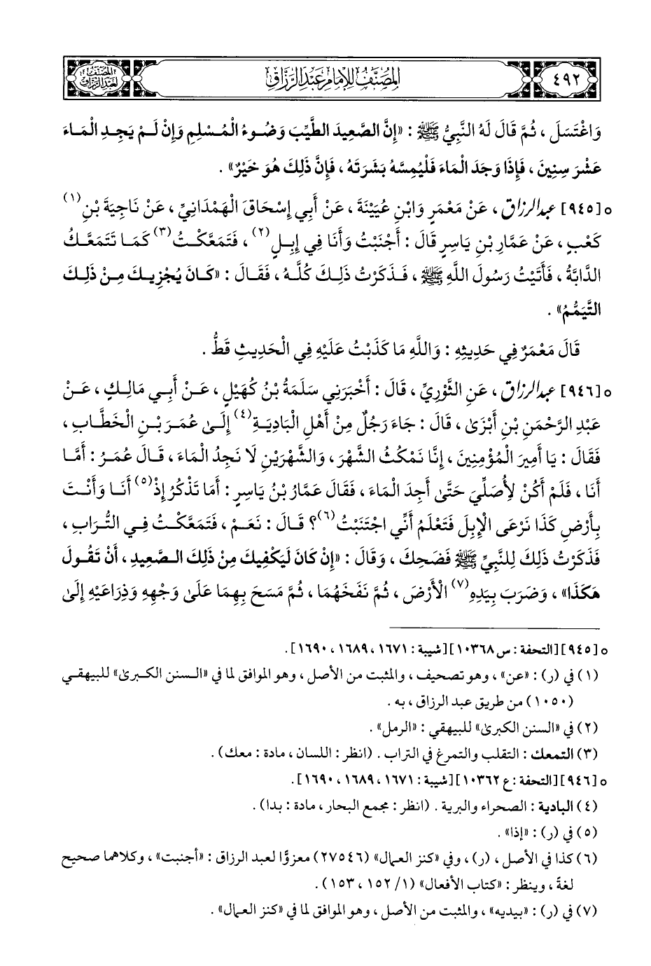 ° [٩٤٥] عبد الرزاق، عَنْ مَعْمَرٍ وَابْنِ عُيَيْنَةَ، عَنْ أَبِي إِسْحَاقَ الْهَمْدَانِيِّ، عَنْ نَاجِيَةَ بْنِ (¬١) كَعْبٍ، عَنْ عَمَّارِ بْنِ يَاسِرٍ قَالَ: أَجْنَبْتُ وَأَنَا فِي إِبِلٍ (¬٢)، فَتَمَعَّكْتُ (¬٣) كَمَا تَتَمَعَّكُ الدَّابةُ، فَأَتَيتُ رَسُولَ اللَّهِ - صلى الله عليه وسلم -، فَذَكَرْتُ ذَلِكَ كُلَّهُ، فَقَالَ: "كَانَ يُجْزِيكَ مِنْ ذَلِكَ التَّيَمُّمُ".