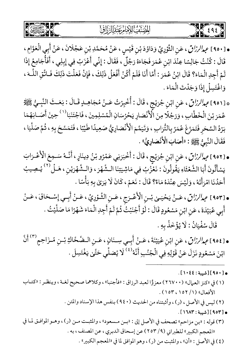 • [٩٥٤] عبد الرزاق، عَنِ ابْنِ عُيَيْنَةَ، عَنْ أَبِي سِنَانٍ، عَنِ الضحَّاكِ بْنِ مُزَاحِمٍ (¬٣) أن ابْنَ مَسْعُودٍ نَزَلَ عَنْ قَوْلِهِ فِي الْجُنُبِ أَنَّهُ (¬٤) لَا يُصَلِّي حَتَّى يَغْتَسِلَ.