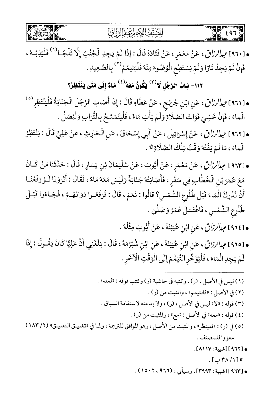 • [٩٦٣] عبد الرزاق، عَنْ مَعْمَرٍ، عَنْ أَيُّوبَ، عَنْ سُلَيْمَانَ بْنِ يَسَارٍ، قَالَ: حَدَّثَنَا مَنْ كَانَ مَعَ عُمَرَ بْنِ الْخَطَّابِ فِي سَفَرٍ، فَأَصَابَتْهُ جَنَابَةٌ وَلَيْسَ مَعَهُ مَاءٌ، فَقَالَ: أَتَرَوْنَا لَوْ رَفَعْنَا أَنْ نُدْرِكَ الْمَاءَ قَبْلَ طُلُوعِ الشَّمْسِ؟ قَالُوا: نَعَمْ، قَالَ: فَرَفَعُوا دَوَابَّهُمْ، فَجَاءُوا قَبْلَ طُلُوعِ الشَّمْسِ، فَاغْتَسَلَ عُمَرُ وَصَلَّى.