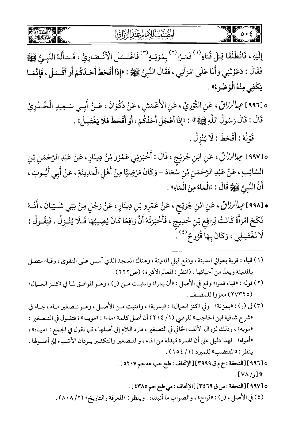 ° [٩٩٧] عبد الرازق، عَنِ ابْنِ جُرَيْجٍ، قَالَ: أَخْبَرَنِي عَمْرُو بْنُ دِينَارٍ، عَنْ عَبْدِ الرَّحْمَنِ بْنِ السَّائِبِ، عَنْ عَبْدِ الرَّحْمَنِ بْنِ سُعَادَ - وَكَانَ مَرْضِيًّا مِنْ أَهْلِ الْمَدِينَةِ، عَنْ أَبِي أَيُّوبَ، أَنَّ النَّبِيَّ - صلى الله عليه وسلم - قالَ: "الْمَاءُ مِنَ الْمَاءِ".