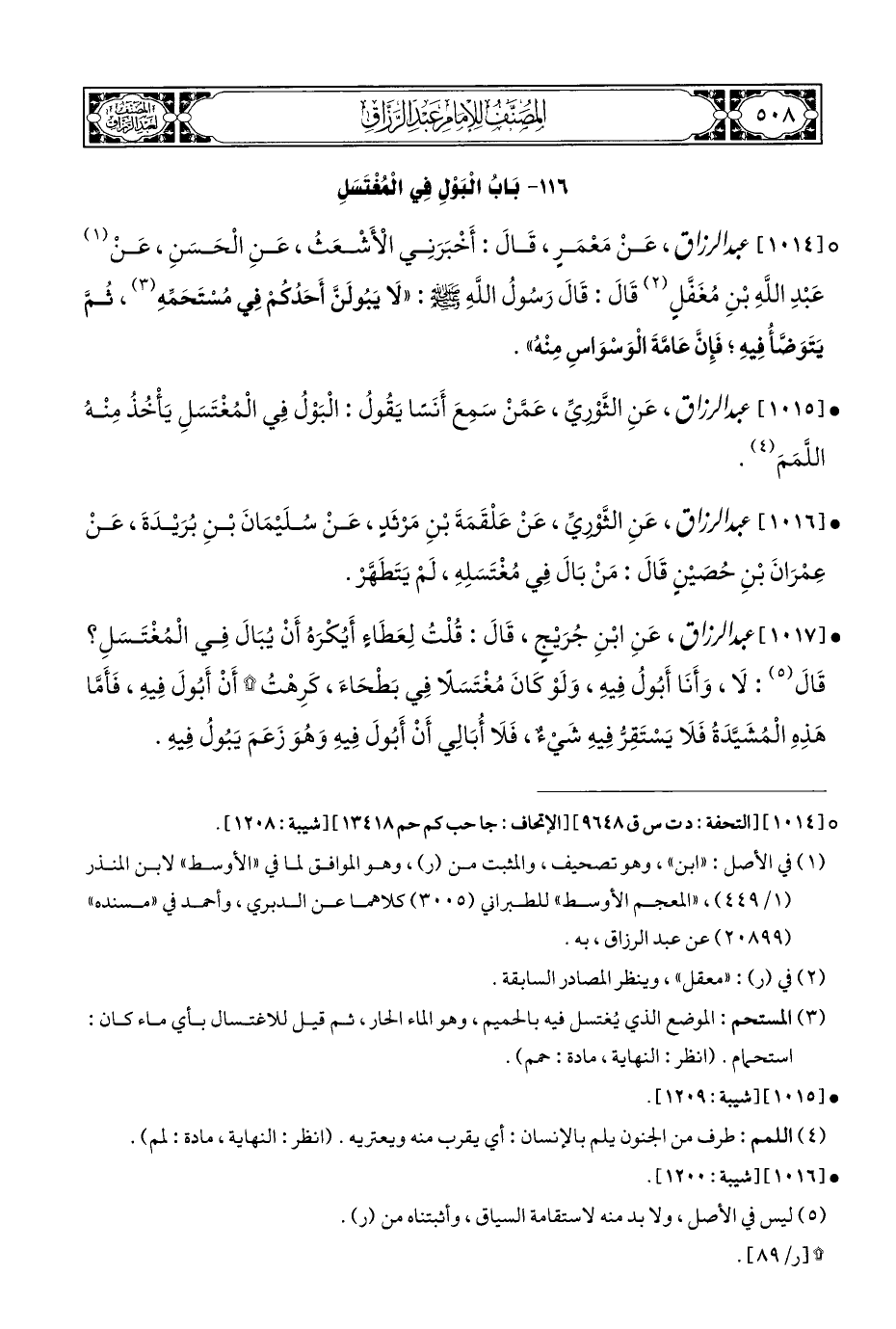 ° [١٠١٤] عبد الرزاق، عَنْ مَعْمَرٍ، قَالَ: أَخْبَرَنِي الْأَشْعَثُ، عَنِ الْحَسَنِ، عَنْ (¬١) عَبْدِ اللَّهِ بْنِ مُغَفَّلٍ (¬٢) قَالَ: قَالَ رَسُولُ اللَّهِ - صلى الله عليه وسلم -: "لَا يَبُولَنَّ أَحَدُكُمْ فِي مُسْتَحَمِّهِ (¬٣)، ثُمَّ يَتَوَضَّأُ فِيهِ؛ فَإِنَّ عَامَّةَ الْوَسْوَاسِ مِنْهُ".