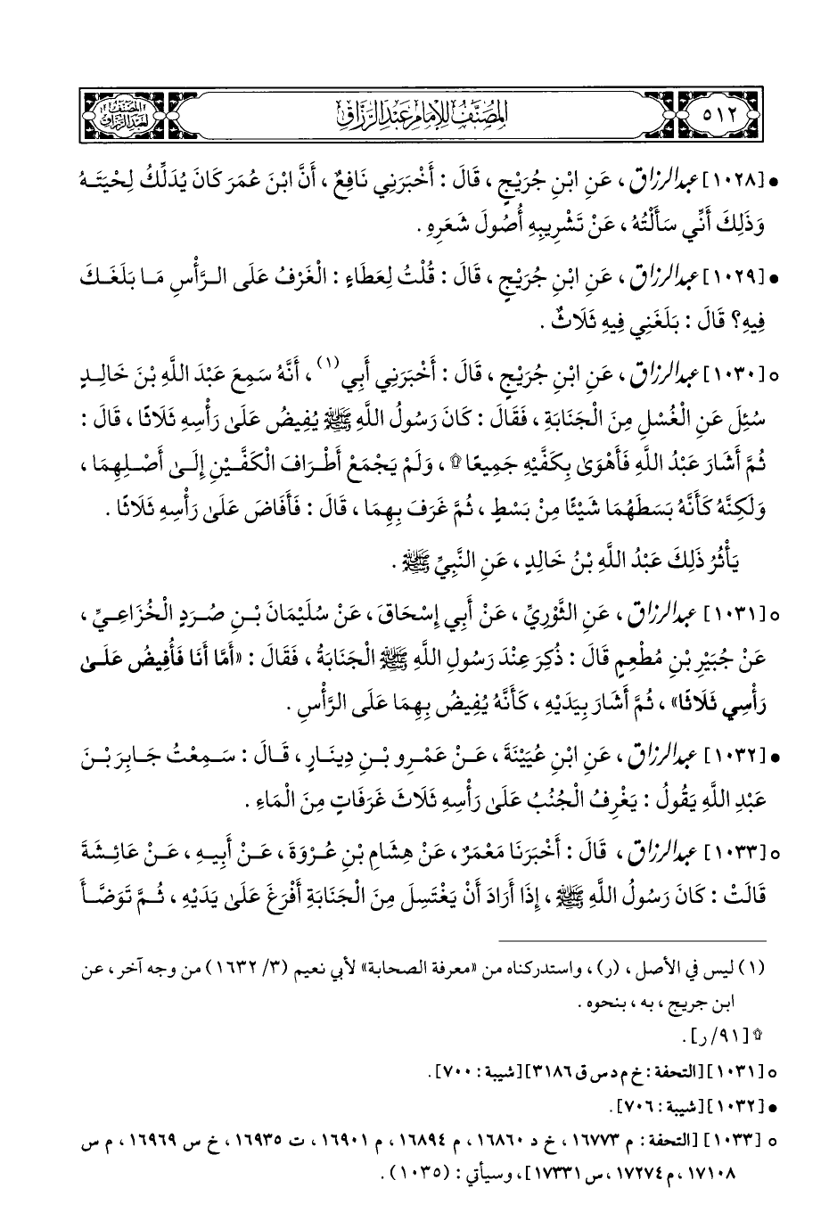° [١٠٣١] عبد الرزاق، عَنِ الثَّوْرِيِّ، عَنْ أَبِي إِسْحَاقَ، عَنْ سُلَيْمَانَ بْنِ صُرَدٍ الْخُزَاعِيِّ، عَنْ جُبَيْرِ بْنِ مُطْعِمٍ قَالَ: ذُكِرَ عِنْدَ رَسُولِ اللَّهِ - صلى الله عليه وسلم - الْجَنَابَةُ، فَقَالَ: "أَمَّا أَنَا فَأُفِيضُ عَلَى رَأْسِي ثلَاثًا"، ثُمَّ أَشَارَ بِيَدَيْهِ، كَأَنَّهُ يُفِيضُ بِهِمَا عَلَى الرَّأْسِ.