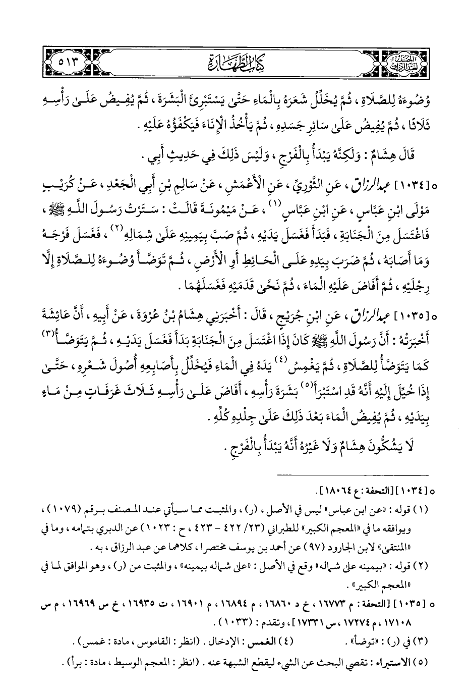 ° [١٠٣٤] عبد الرزاق، عَنِ الثَّوْرِيِّ، عَنِ الْأَعْمَشِ، عَنْ سَالِمِ بْنِ أَبِي الْجَعْدِ، عَنْ كُرَيْبٍ مَوْلَى ابْنِ عَبَّاسٍ، عَنِ ابْنِ عَبَّاسٍ (¬١)، عَنْ مَيْمُونَةَ قَالَتْ: سَتَرْتُ رَسُولَ اللَّهِ - صلى الله عليه وسلم -، فَاغْتَسَلَ مِنَ الْجَنَابَةِ، فَبَدَأَ فَغَسَلَ يَدَيْهِ، ثُمَّ صَبَّ بِيَمِينِهِ عَلَى شِمَالِهِ (¬٢)، فَغَسَلَ فَرْجَهُ وَمَا أَصَابَهُ، ثُمَّ ضَرَبَ بِيَدِهِ عَلَى الْحَائِطِ أَوِ الْأَرْضِ، ثُمَّ تَوَضَّأَ وُضُوءَهُ لِلصَّلَاةِ إِلَّا رِجْلَيْهِ، ثُمَّ أَفَاضَ عَلَيْهِ الْمَاءَ، ثُمَّ نَحَّى قَدَمَيْهِ فَغَسَلَهُمَا.