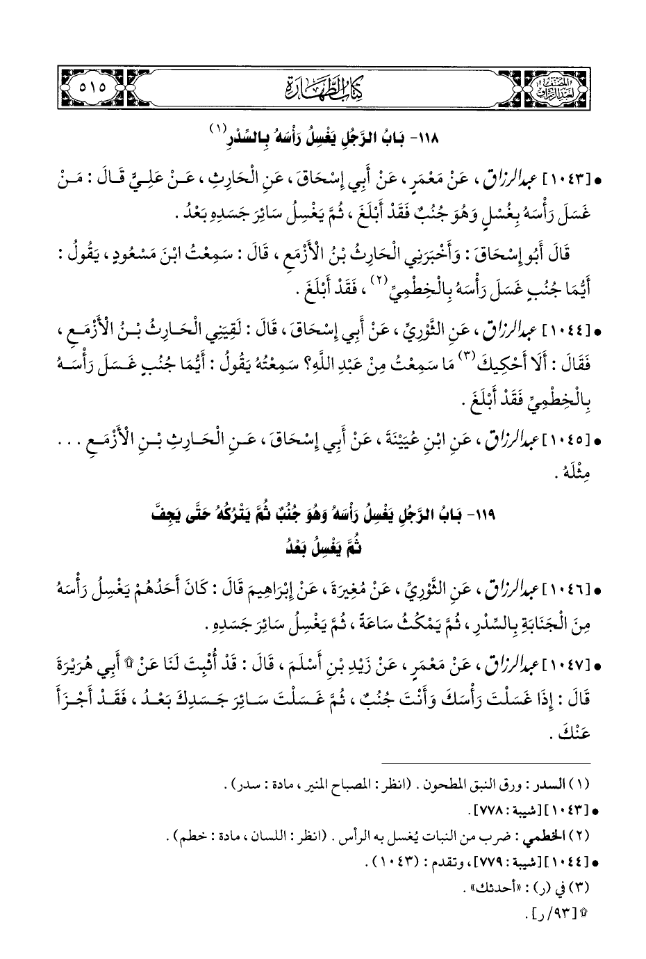 • [١٠٤٤] عبد الرزاق، عَنِ الثَّوْرِيِّ، عَنْ أَبِي إِسْحَاقَ، قَالَ: لَقِيَنِي الْحَارِثُ بْنُ الْأَزْمَعِ، فَقَالَ: أَلَا أَحْكِيكَ (¬٣) مَا سَمِعْتُ مِنْ عَبْدِ اللَّهِ؟ سَمِعْتُهُ يَقُولُ: أَيُّمَا جُنُبٍ غَسَلَ رَأْسَهُ بِالْخِطْمِيِّ فَقَدْ أَبْلَغَ.