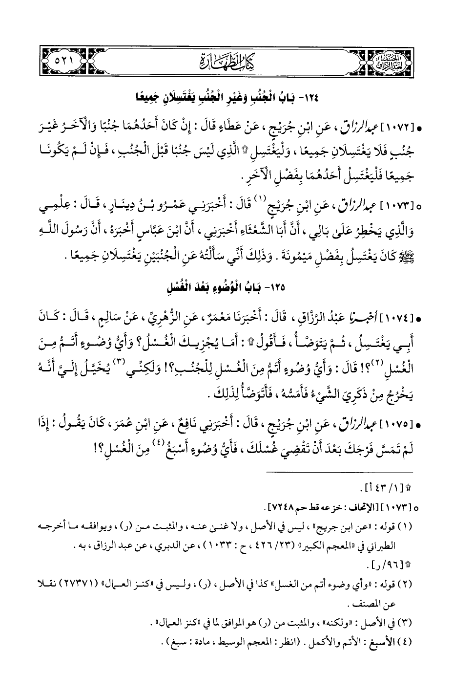° [١٠٧٣] عبد الرزاق، عَنِ ابْنِ جُرَيْجٍ (¬١) قَالَ: أَخْبَرَنِي عَمْرُو بْنُ دِينَارٍ، قَالَ: عِلْمِي وَالَّذِي يَخْطِرُ عَلَى بَالِي، أَنَّ أَبَا الشَّعْثَاءِ أَخْبَرَنِي، أَنَّ ابْنَ عَبَّاسٍ أَخْبَرَهُ، أَنَّ رَسُولَ اللَّهِ - صلى الله عليه وسلم - كَانَ يَغْتَسِلُ بِفَضْلِ مَيْمُونَةَ. وَذَلِكَ أَنِّي سَأَلْتُهُ عَنِ الْجُنُبَيْنِ يَغْتَسِلَانِ جَمِيعًا.