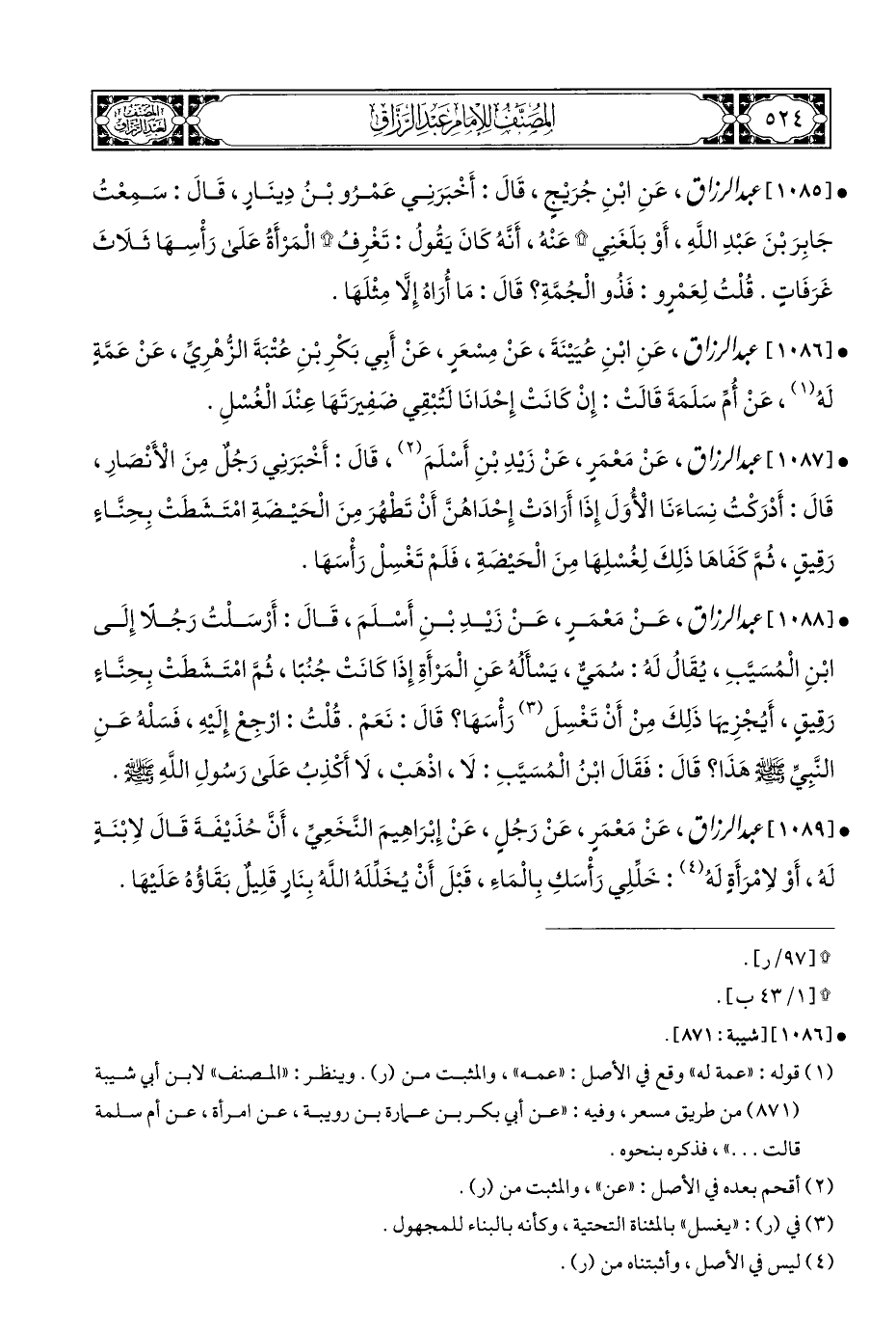 • [١٠٨٧] عبد الرزاق، عَنْ مَعْمَرٍ، عَنْ زَيْدِ بْنِ أَسْلَمَ (¬٢)، قَالَ: أَخْبَرَنِي رَجُلٌ مِنَ الْأَنْصَارِ، قَالَ: أَدْرَكْتُ نِسَاءَنَا الْأُوَلَ إِذَا أَرَادَتْ إِحْدَاهُنَّ أَنْ تَطْهُرَ مِنَ الْحَيْضَةِ امْتَشَطَتْ بِحِنَّاءٍ رَقِيقٍ، ثُمَّ كَفَاهَا ذَلِكَ لِغُسْلِهَا مِنَ الْحَيْضَةِ، فَلَمْ تَغْسِلْ رَأْسَهَا.