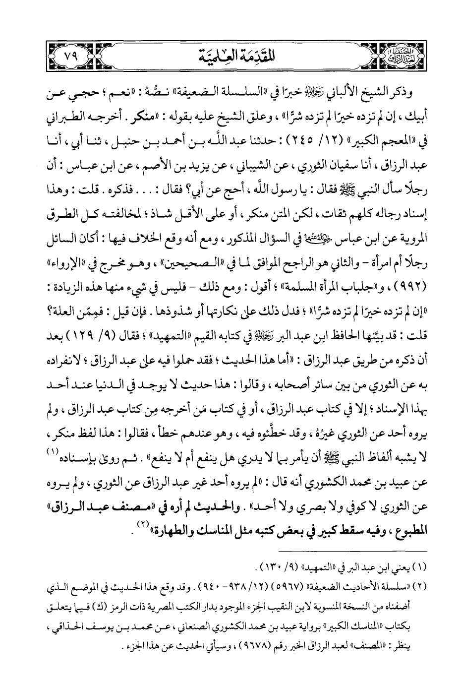 (¬٢) "سلسلة الأحاديث الضعيفة" (٥٩٦٧) (١٢/ ٩٣٨ - ٩٤٠). وقد وقع هذا الحديث في الموضع الذي أضفناه من النسخة المنسوية لابن النقيب الجزء الموجود بدار الكتب المصرية ذات الرمز (ك) فيما يتعلق بكتاب "المناسك الكبير" برواية عبيد بن محمد الكشوري الصنعاني، عن محمد بن يوسف الحذاقي، ينظر: "المصنف" لعبد الرزاق الخبر رقم (٩٦٧٨)، وسيأتي الحديث عن هذا الجزء.