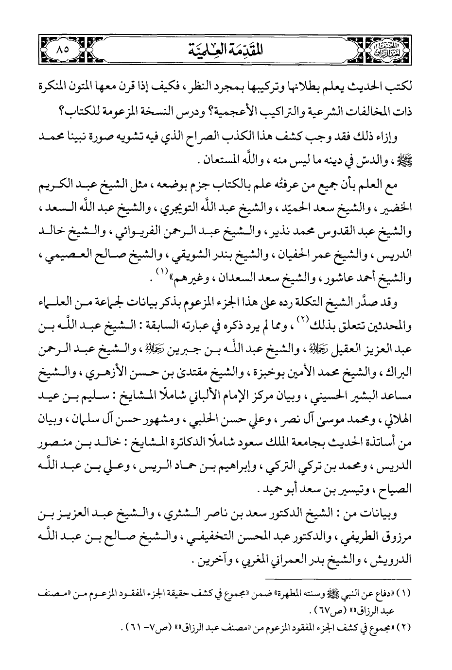 (¬١) "دفاع عن النبي - صلى الله عليه وسلم - وسنته المطهرة" ضمن "مجموع في كشف حقيقة الجزء المفقود المزعوم من "مصنف عبد الرزاق"" (ص ٦٧).