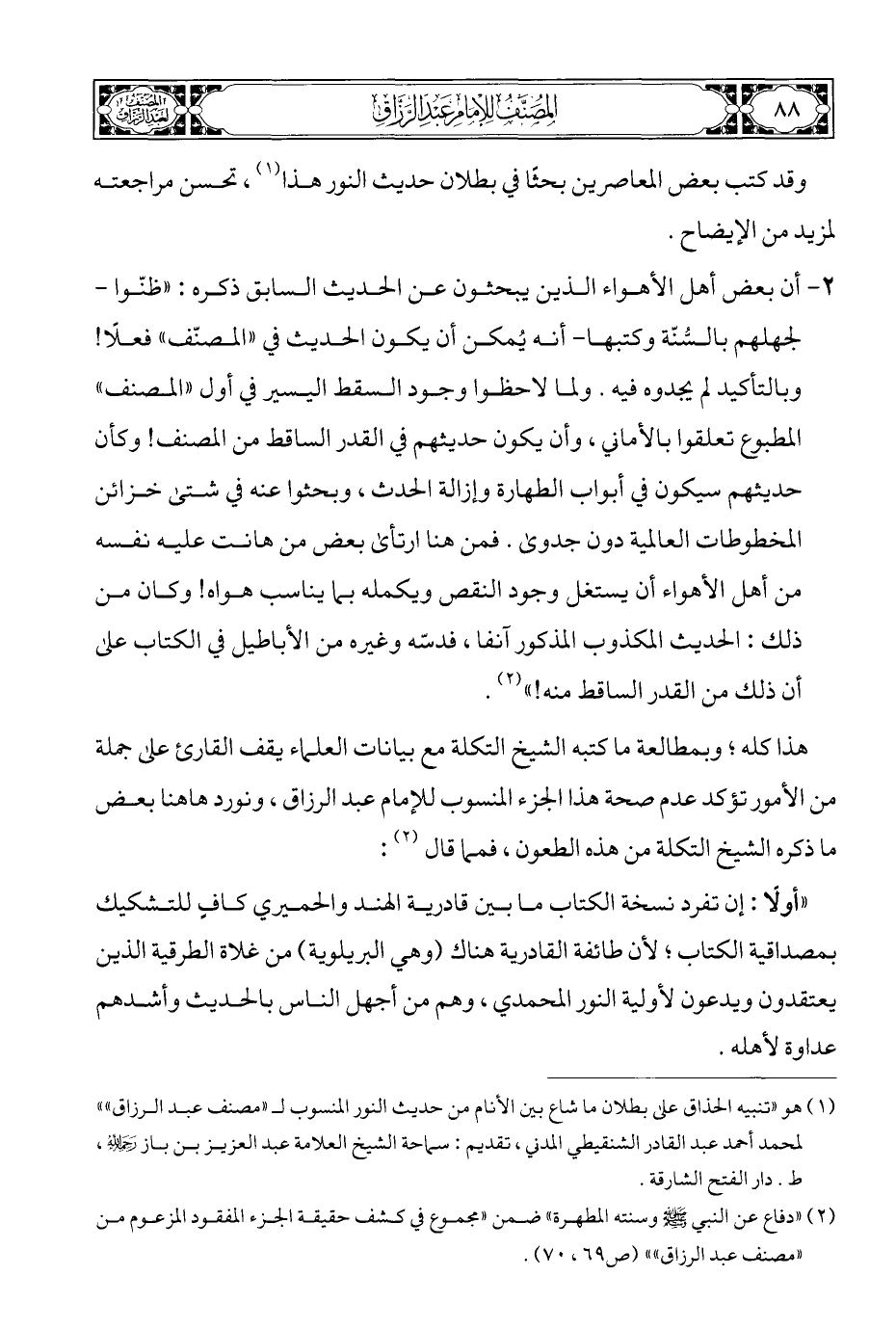 (¬١) هو "تنبيه الحذاق على بطلان ما شاع بين الأنام من حديث النور المنسوب لـ"مصنف عبد الرزاق"" لمحمد أحمد عبد القادر الشنقيطي المدني، تقديم: سماحة الشيخ العلامة عبد العزيز بن باز رحمهُ اللهُ، ط. دار الفتح الشارقة.
