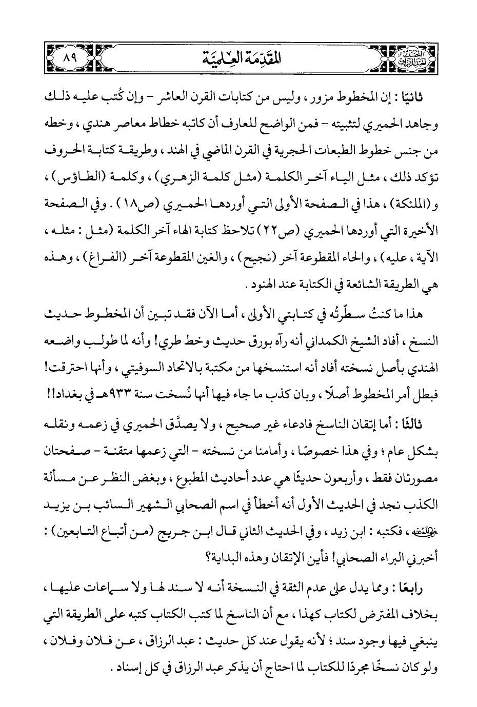 ثانيًا: إن المخطوط مزور، وليس من كتابات القرن العاشر - وإن كُتب عليه ذلك وجاهد الحميري لتثبيته - فمن الواضح للعارف أن كاتبه خطاط معاصر هندي، وخطه من جنس خطوط الطبعات الحجرية في القرن الماضي في الهند، وطريقة كتابة الحروف تؤكد ذلك، مثل الياء آخر الكلمة (مثل كلمة الزهري)، وكلمة (الطاؤس)، و (الملئكة)، هذا في الصفحة الأولى التي أوردها الحميري (ص ١٨). وفي الصفحة الأخيرة التي أوردها الحميري (ص ٢٢) تلاحظ كتابة الهاء آخر الكلمة (مثل: مثله، الآية، عليه)، والحاء المقطوعة آخر (نجيح)، والغين المقطوعة آخر (الفراغ)، وهذه هي الطريقة الشائعة في الكتابة عند الهنود.