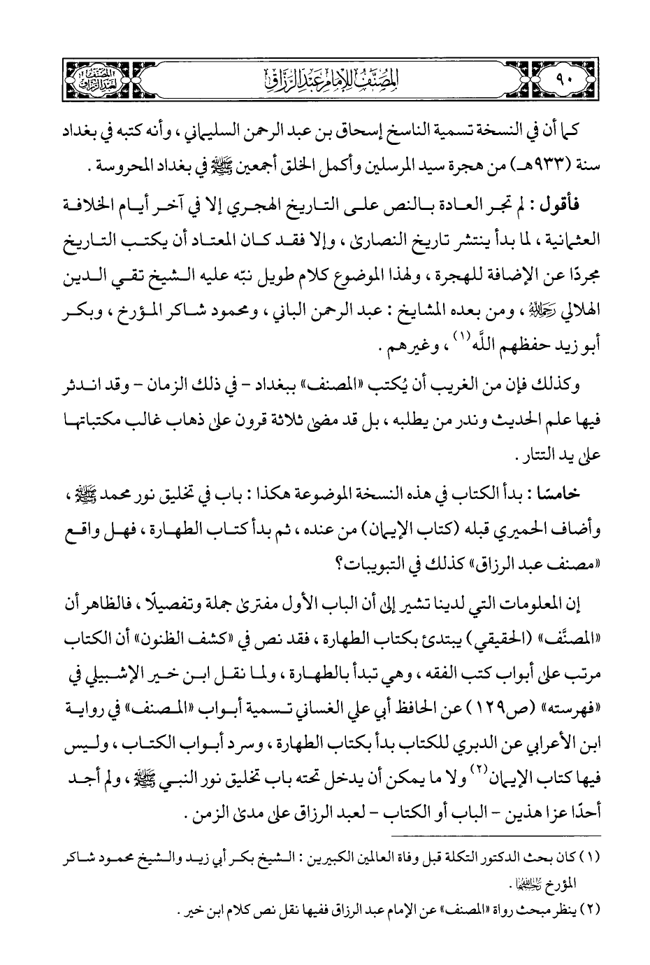 خامسًا: بدأ الكتاب في هذه النسخة الموضوعة هكذا: باب في تخليق نور محمد - صلى الله عليه وسلم -، وأضاف الحميري قبله (كتاب الإيمان) من عنده، ثم بدأ كتاب الطهارة، فهل واقع "مصنف عبد الرزاق" كذلك في التبويبات؟
