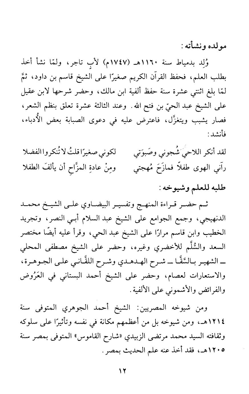 وُلِد بدمياط سنة 1160 هـ (1747 م) لأبٍ تاجر، ولمّا نشأ أخذ بطلب العلم، فحفظ القرآن الكريم صغيرًا على الشيخ قاسم بن داود، ثمَّ لمَّا بلغ اثنتي عشرة سنة حفظ ألفية ابن مالك، وحضر شرحها لابن عقيل على الشيخ عبد الحيّ بن فتح الله. وعند الثالثة عشرة تعلق بنظم الشعر، فصار يشبب ويتغزَّل، فاعترض عليه في دعوى الصبابة بعض الأُدباء، فأنشد: