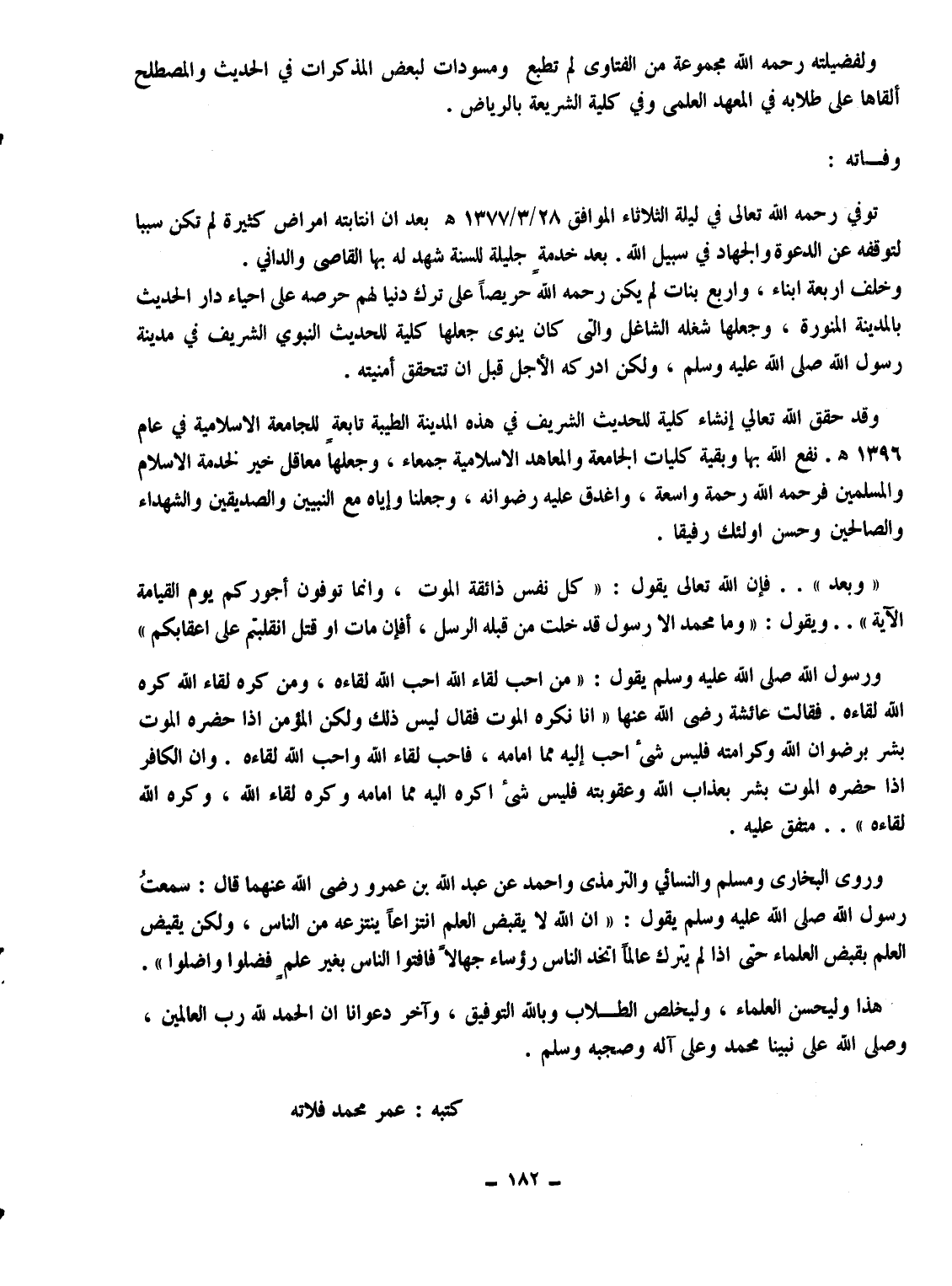 وقد حقق الله تعالى إنشاء كلية الحديث في هذه المدينة الطيبة تابعة للجامعة الإسلامية في عام 1396هـ نفع الله بها وبقية كليات الجامعة والمعاهد الإسلامية جمعاء, وجعلها معاقل خير لخدمة الإسلام والمسلمين فرحمه الله رحمة واسعة، وأغدق عليه رضوانه، وجعلنا وإياه مع النبيين والصديقين والشهداء والصالحين وحسن أولئك رفيقا.