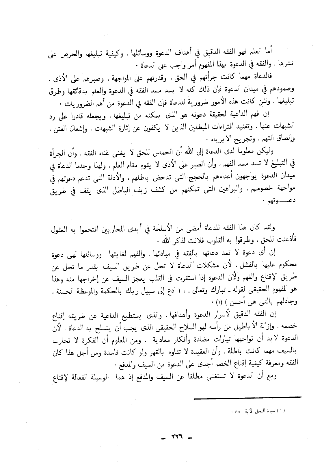 إِن أَي دَعْوَة لَا تمد دعاتها بالفقه فِي مبادئها، والفهم لغايتها ووسائلها لهي دَعْوَة مَحْكُوم عَلَيْهَا بالفشل، لِأَن مشكلات الدعاة لَا تحل عَن طَرِيق السَّيْف بِقدر مَا تحل عَن طَرِيق الْإِقْنَاع والفهم، وَلِأَن الدعْوَة إِذا اسْتَقَرَّتْ فِي الْقلب يعجز السَّيْف عَن إخْرَاجهَا مِنْهُ، وَهَذَا هُوَ الْمَفْهُوم الْحَقِيقِيّ لقَوْله تبَارك وَتَعَالَى: {ادْعُ إِلَى سَبِيلِ رَبِّكَ بِالْحِكْمَةِ وَالْمَوْعِظَةِ الْحَسَنَةِ وَجَادِلْهُمْ بِالَّتِي هِيَ أَحْسَنُ} 1.