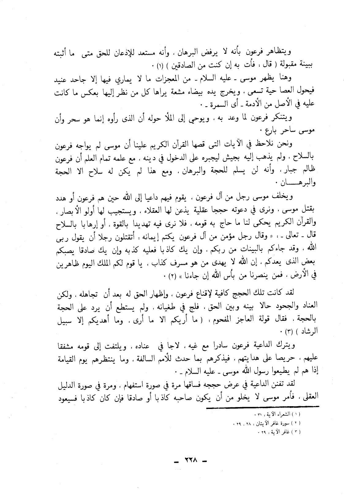 وَنحن نلاحظ فِي الْآيَات الَّتِي قصها الْقُرْآن الْكَرِيم علينا أَن مُوسَى لم يواجه فِرْعَوْن بِالسِّلَاحِ، وَلم يذهب إِلَيْهِ بِجَيْش ليجبره على الدُّخُول فِي دينه، مَعَ علمه تَمام الْعلم أَن فِرْعَوْن ظَالِم جَبَّار، وَأَنه لن يسلم للحجة والبرهان، وَمَعَ هَذَا لم يكن مَعَه سلَاح إِلَّا الْحجَّة والبرهان.