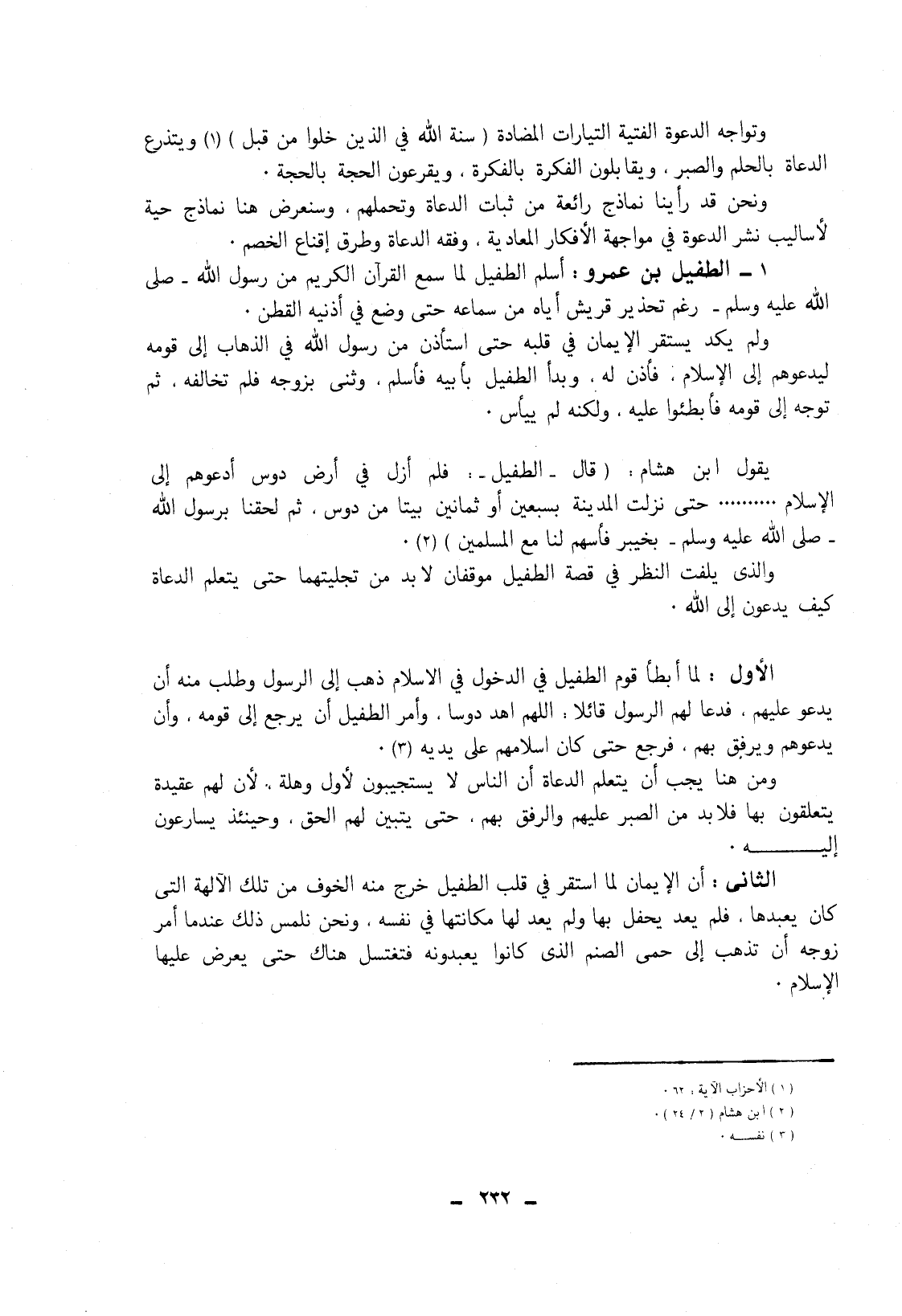 وَالَّذِي يلفت النّظر فِي قصَّة الطُّفَيْل موقفان لابد من تجليتهما؛ حَتَّى يتَعَلَّم الدعاة كَيفَ يدعونَ إِلَى الله: