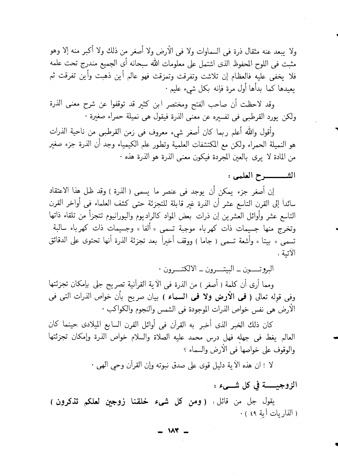 ومما أرى أن كلمة (أصغر) من الذرة في الآية القرآنية تصريح جلي بإمكان تجزئتها وفي قوله تعالى: {فِي الأَرْضِ وَلا فِي السَّمَاءِ} بيان صريح بأن خواص الذرات التي في الأرض هي نفس خواص الذرات الموجودة في الشمس والنجوم والكواكب.