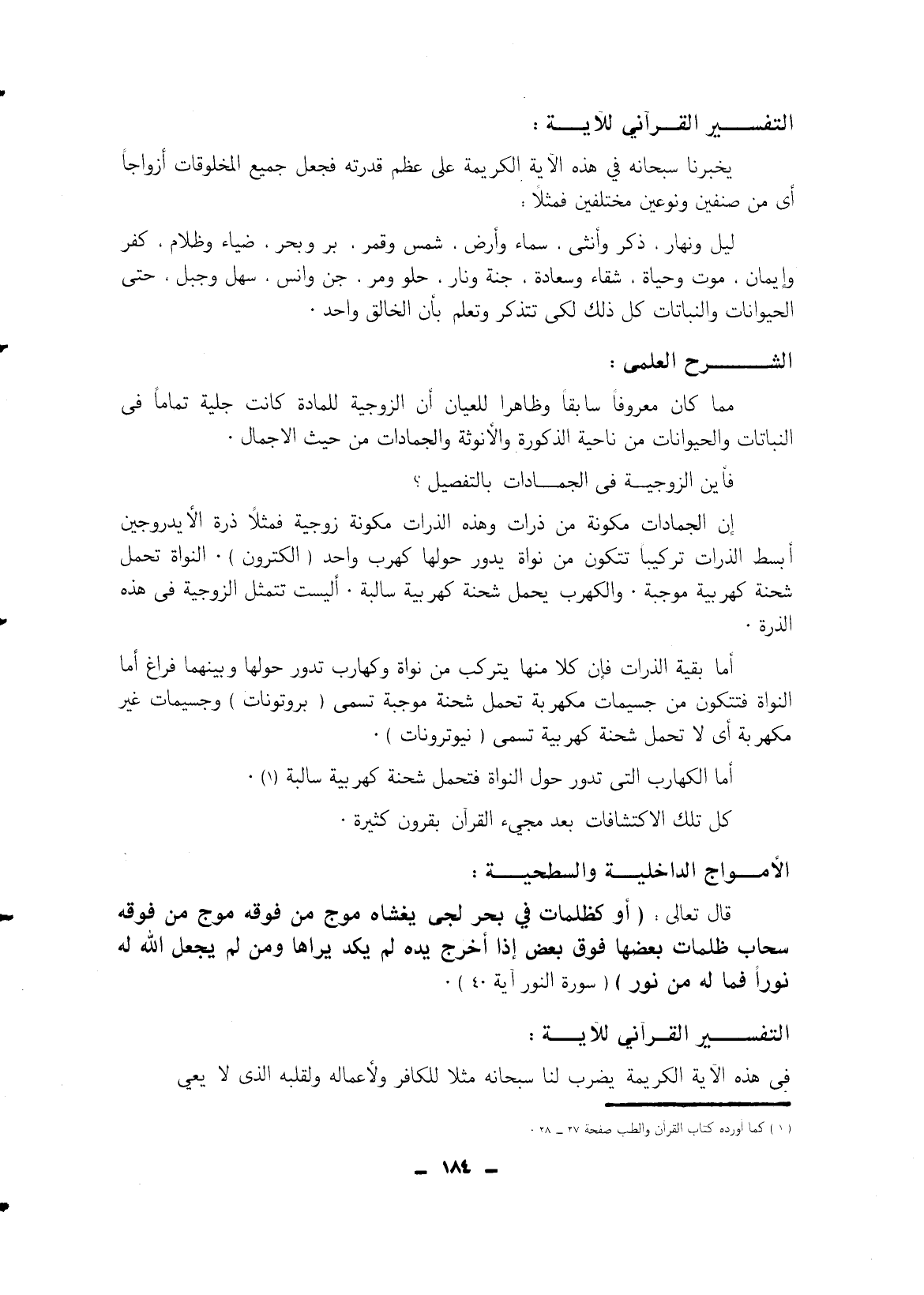 إن الجمادات مكونة من ذرات وهذه الذرات مكونة زوجية فمثلا ذرة الأيدروجين أبسط الذرات تركيبا تتكون من نواة يدور حولها كهرب وأحد (الكترون) النواة تحمل شحنة كهربية موجبة. والكهرب يحمل شحنة كهربية سالبة. أليست تتمثل الزوجية في هذه الذرة.
