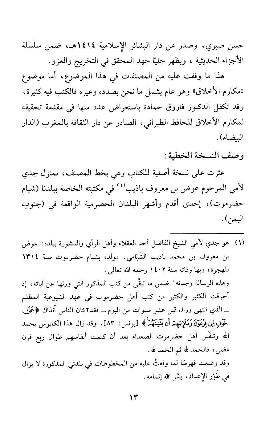 (¬1) هو جدي لأمي الشيخ الفاضل أحد العقلاء وأهل الرأي والمشورة ببلده: عوض بن معروف بن محمد باذيب الشَبَامي. مولده بشبام حضرموت سنة 1314 للهجرة، وبها وفاته سنة 1402 رحمه الله تعالى.