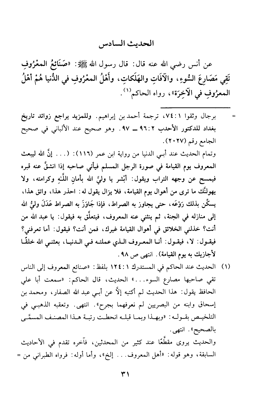 عن أنس رضي الله عنه قال: قال رسول الله - صلى الله عليه وسلم -: "صَنَائِعُ المعْرُوفِ تَقِي مَصَارِعَ السُّوءِ، والآفَاتِ والهَلَكاتِ، وأَهْلُ المعْرُوفِ في الدُّنيا هُمْ أهْلُ المعرُوفِ في الآخِرَة"، رواه الحاكم (¬1).
