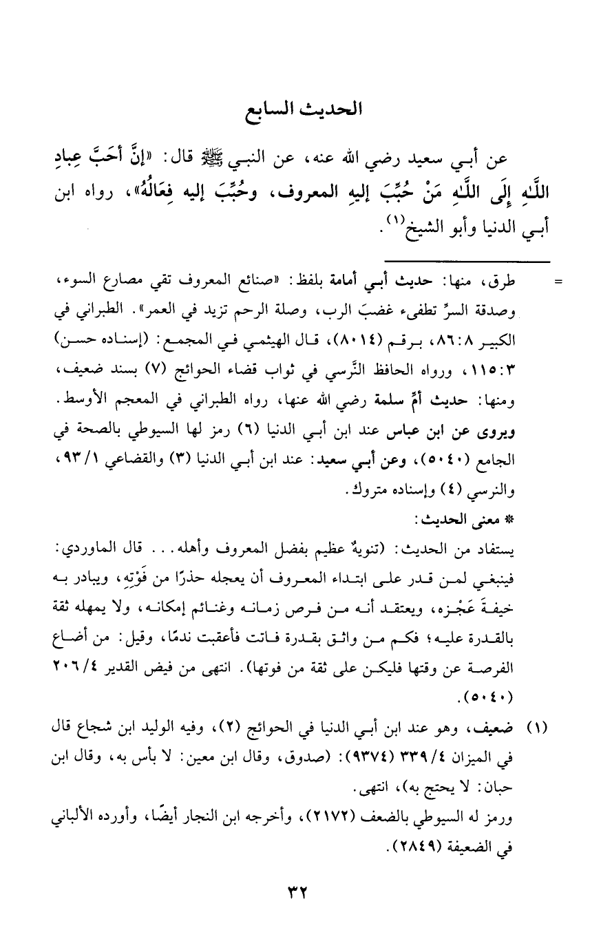 عن أبي سعيد رضي الله عنه، عن النبي - صلى الله عليه وسلم - قال: "إنَّ أحَب عِبادِ اللهِ إِلَى اللهِ مَنْ حُبِّبَ إليهِ المعروف، وحُبِّبَ إليه فِعَالُهُ"، رواه ابن أبي الدنيا وأبو الشيخ (¬1).
