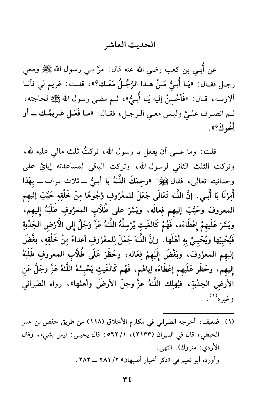 عن أُبي بن كعب رضي الله عنه قال: مرَّ بي رسول الله - صلى الله عليه وسلم - ومعي رجل فقال: "يَا أُبيُّ مَنْ هذا الرَّجُلُ مَعَك؟ "، قلت: غريم لي فأنا ألازمه، قال: "فَأحْسِنْ إليه يَا أُبيُّ"، ثم مضى رسول الله - صلى الله عليه وسلم - لحاجته، ثم انصرف عليَّ وليس معي الرجل، فقال: "ما فَعَل غريمُك -أو أَخُوكَ؟ ".