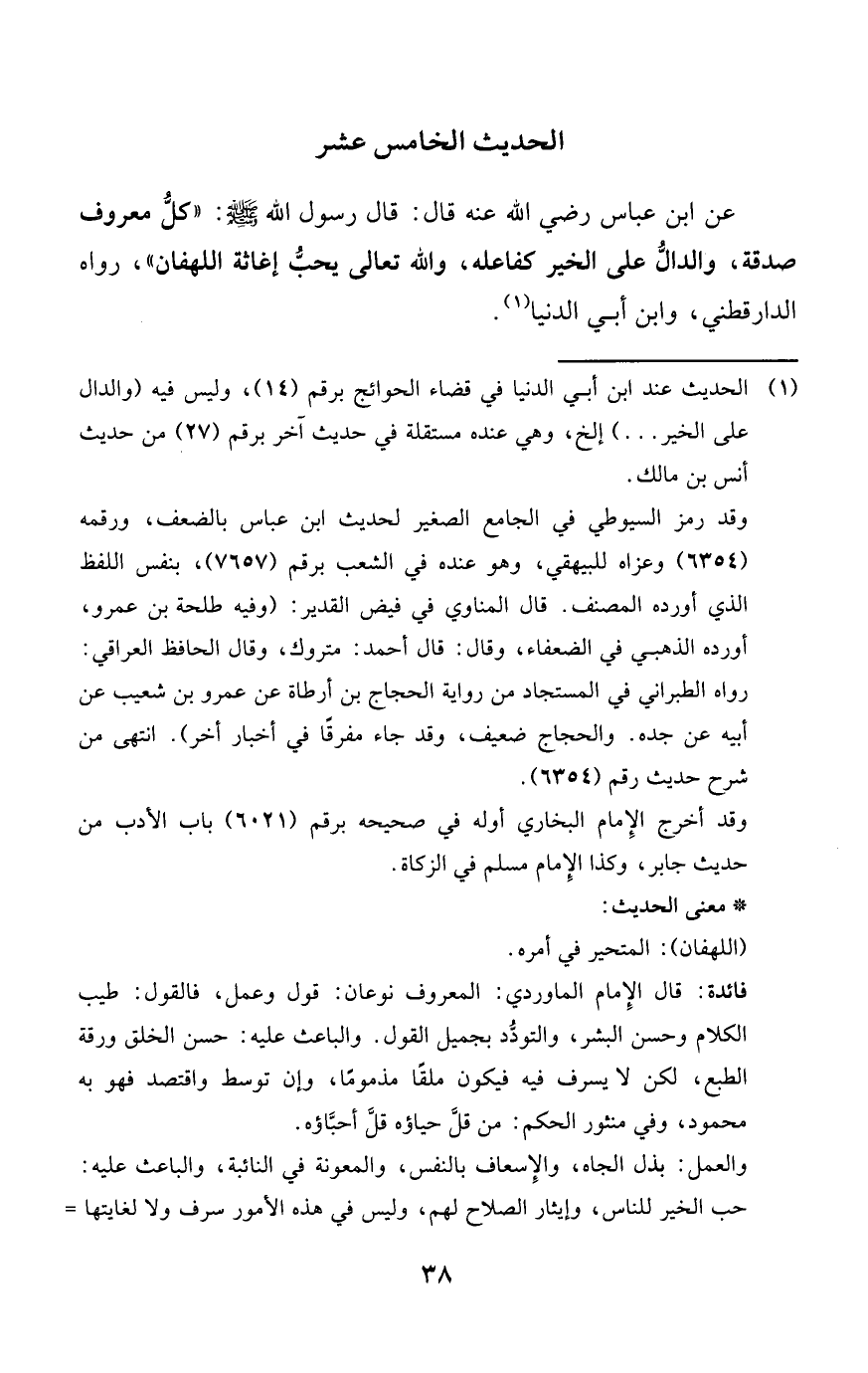 عن ابن عباس رضي الله عنه قال: قال رسول الله - صلى الله عليه وسلم -: "كلُّ معروف صدقة، والدالُّ على الخير كفاعله، والله تعالى يحبُّ إغاثة اللهفان"، رواه الدارقطني، وابن أبي الدنيا (¬1).