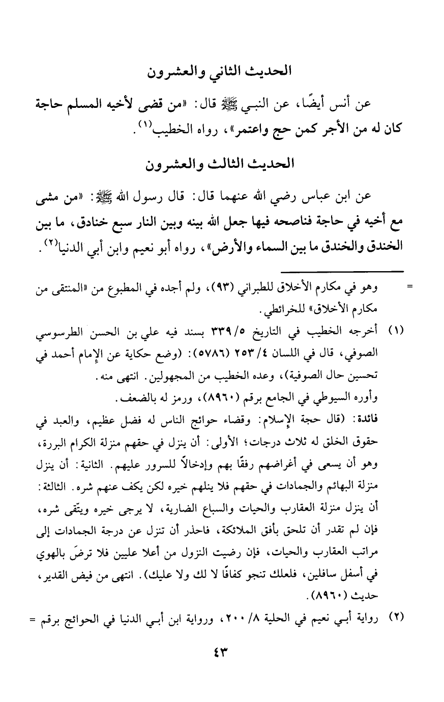 فائدة: (قال حجة الإِسلام: وقضاء حوائج الناس له فضل عظيم، والعبد في حقوق الخلق له ثلاث درجات؛ الأولى: أن ينزل في حقهم منزلة الكرام البررة، وهو أن يسعى في أغراضهم رفقًا بهم وإدخالًا للسرور عليهم. الثانية: أن ينزل منزلة البهائم والجمادات في حقهم فلا ينلهم خيره لكن يكف عنهم شره. الثالثة: أن ينزل منزلة العقارب والحيات والسباع الضارية، لا يرجى خيره ويتّقى شره، فإن لم تقدر أن تلحق بأفق الملائكة، فاحذر أن تنزل عن درجة الجمادات إلى مراتب العقارب والحيات، فإن رضيت النزول من أعلى عليين فلا ترضَ بالهوي في أسفل سافلين، فلعلك تنجو كفافًا لا لك ولا عليك). انتهى من فيض القدير، حديث (8960).