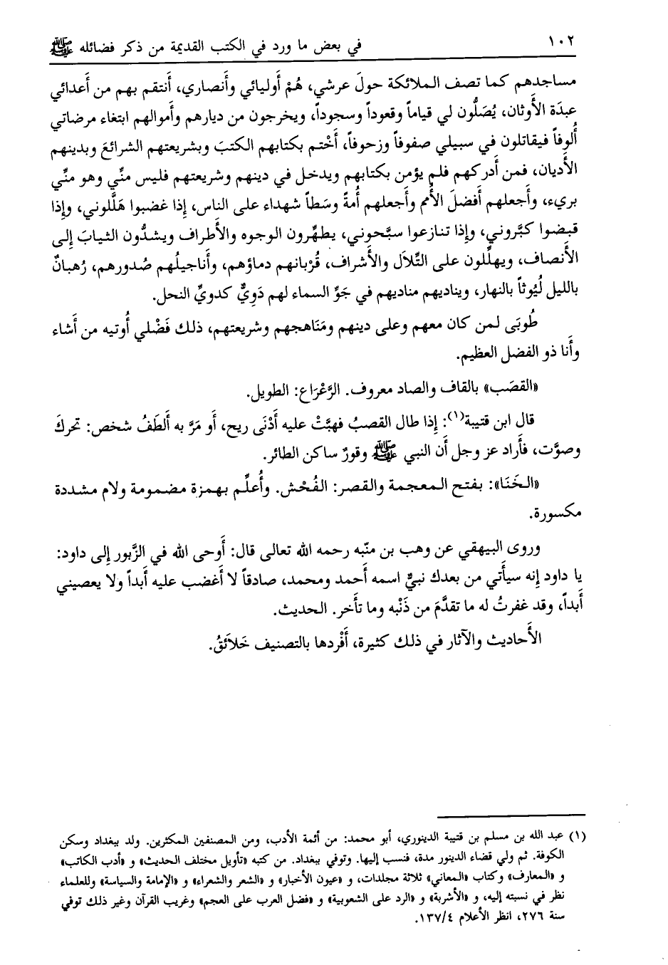 [ (1) ] عبد الله بن مسلم بن قتيبة الدينوري، أبو محمد: من أئمة الأدب، ومن المصنفين المكثرين. ولد ببغداد وسكن الكوفة. ثم ولي قضاء الدينور مدة، فنسب إليها. وتوفي ببغداد. من كتبه «تأويل مختلف الحديث» و «أدب الكاتب» و «المعارف» وكتاب «المعاني» ثلاثة مجلدات، و «عيون الأخبار» و «الشعر والشعراء» و «الإمامة والسياسة» وللعلماء نظر في نسبته إليه، و «الأشربة» و «الرد على الشعوبية» و «فضل العرب على العجم» وغريب القرآن وغير ذلك توفي سنة 276، انظر الأعلام 4/ 137.