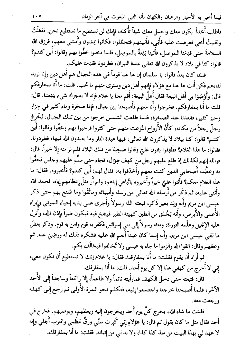 فو الله إنهم لكذلك إذ طلع عليهم رجل من كهف طوال، فجاء حتى سلّم عليهم وجلس فحفّوا به وعظّمه أصحابي الذين كنت معهم وأحدقوا به، فقال لهم: أين كنتم؟ فأخبروه. فقال: ما هذا الغلام معكم؟ فأثنوا عليّ خيراً وأخبروه بإتباعي إياهم، ولم أر مثل إعظامهم إياه، فحمد الله وأثنى عليه، ثم ذكر من أرسله الله تعالى من رسله وأنبيائه وما لقوا وما صنع بهم حتى ذكر عيسى ابن مريم وأنه ولد بغير ذكر، فبعثه الله رسولاً وأجرى على يديه إحياء الموتى وإبراء الأعمى والأبرص، وأنه يخلق من الطين كهيئة الطير فينفخ فيه فيكون طيرا بإذن الله، وأنزل عليه الإنجيل وعلّمه التوراة، وبعثه رسولاً إلى بني إسرائيل فكفر به قوم وآمن به قوم. وذكر بعض ما لقي عيسى ابن مريم، وأنه إنما كان عبداً أنعم الله عليه فشكره ذلك له ورضي عنه. ثم وعظهم وقال: اتقوا الله والزموا ما جاء به عيسى ولا تخالفوا فيخالف بكم.