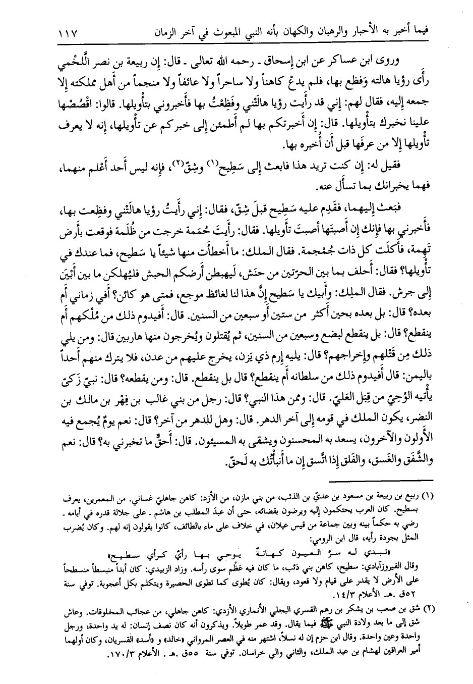 فبعث إليهما، فقدم عليه سطيح قبل شقّ، فقال: إني رأيت رؤيا هالتني وفظعت بها، فأخبرني بها فإنك إن أصبتها أصبت تأويلها. فقال: رأيت حممة خرجت من ظلمة فوقعت بأرض تهمة، فأكلت كل ذات جمجمة. فقال الملك: ما أخطأت منها شيئاً يا سطيح، فما عندك في تأويلها؟ فقال: أحلف بما بين الحرّتين من حنش، ليهبطن أرضكم الحبش فليهلكن ما بين أبين إلى جرش. فقال الملك: وأبيك يا سطيح إنّ هذا لنا لغائظ موجع، فمتى هو كائن؟ أفي زماني أم بعده؟ قال: بل بعده بحين أكثر من ستين أو سبعين من السنين. قال: أفيدوم ذلك من ملكهم أم ينقطع؟ قال: بل ينقطع لبضع وسبعين من السنين، ثم يقتلون ويخرجون منها هاربين قال: ومن يلي ذلك من قتلهم وإخراجهم؟ قال: يليه إرم ذي يزن، يخرج عليهم من عدن، فلا يترك منهم أحدا باليمن: قال أفيدوم ذلك من سلطانه أم ينقطع؟ قال بل ينقطع. قال: ومن يقطعه؟ قال: نبيّ زكيّ يأتيه الوحي من قبل العليّ. قال: وممن هذا النبي؟ قال: رجل من بني غالب بن فهر بن مالك بن النضر، يكون الملك في قومه إلى آخر الدهر. قال: وهل للدهر من آخر؟ قال: نعم يوم يجمع فيه الأولون والآخرون، يسعد به المحسنون ويشقى به المسيئون. قال: أحقّ ما تخبرني به؟ قال: نعم والشفق والغسق، والفلق إذا اتّسق إن ما أنبأتك به لحقّ.