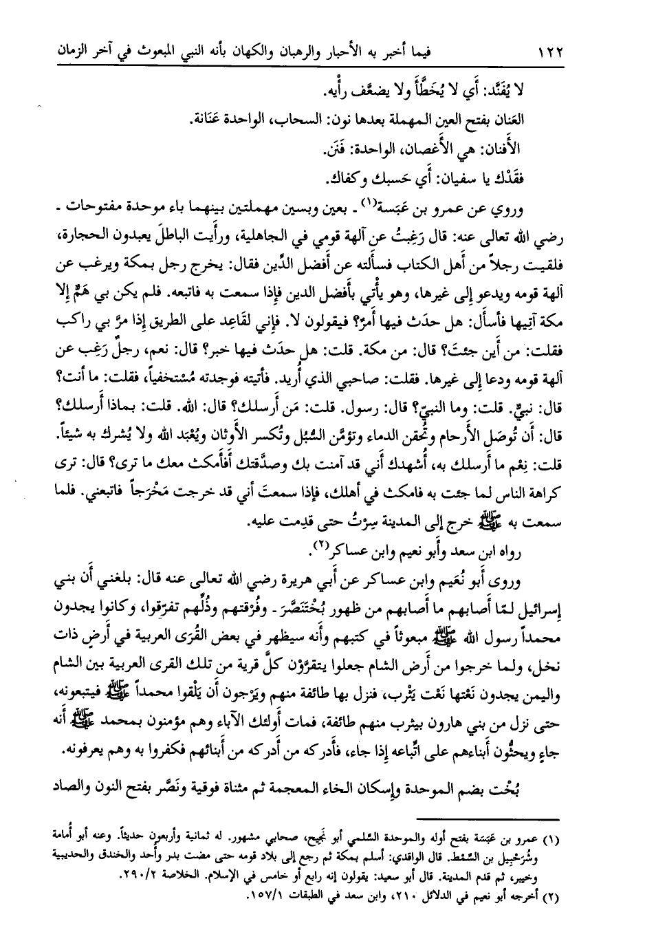 [ (1) ] عمرو بن عبسة بفتح أوله والموحدة السّلمي أبو نجيح، صحابي مشهور. له ثمانية وأربعون حديثاً. وعنه أبو أمامة وشرحبيل بن السّمط. قال الواقدي: أسلم بمكة ثم رجع إلى بلاد قومه حتى مضت بدر وأحد والخندق والحديبية وخيبر، ثم قدم المدينة. قال أبو سعيد: يقولون إنه رابع أو خامس في الإسلام. الخلاصة 2/ 290.