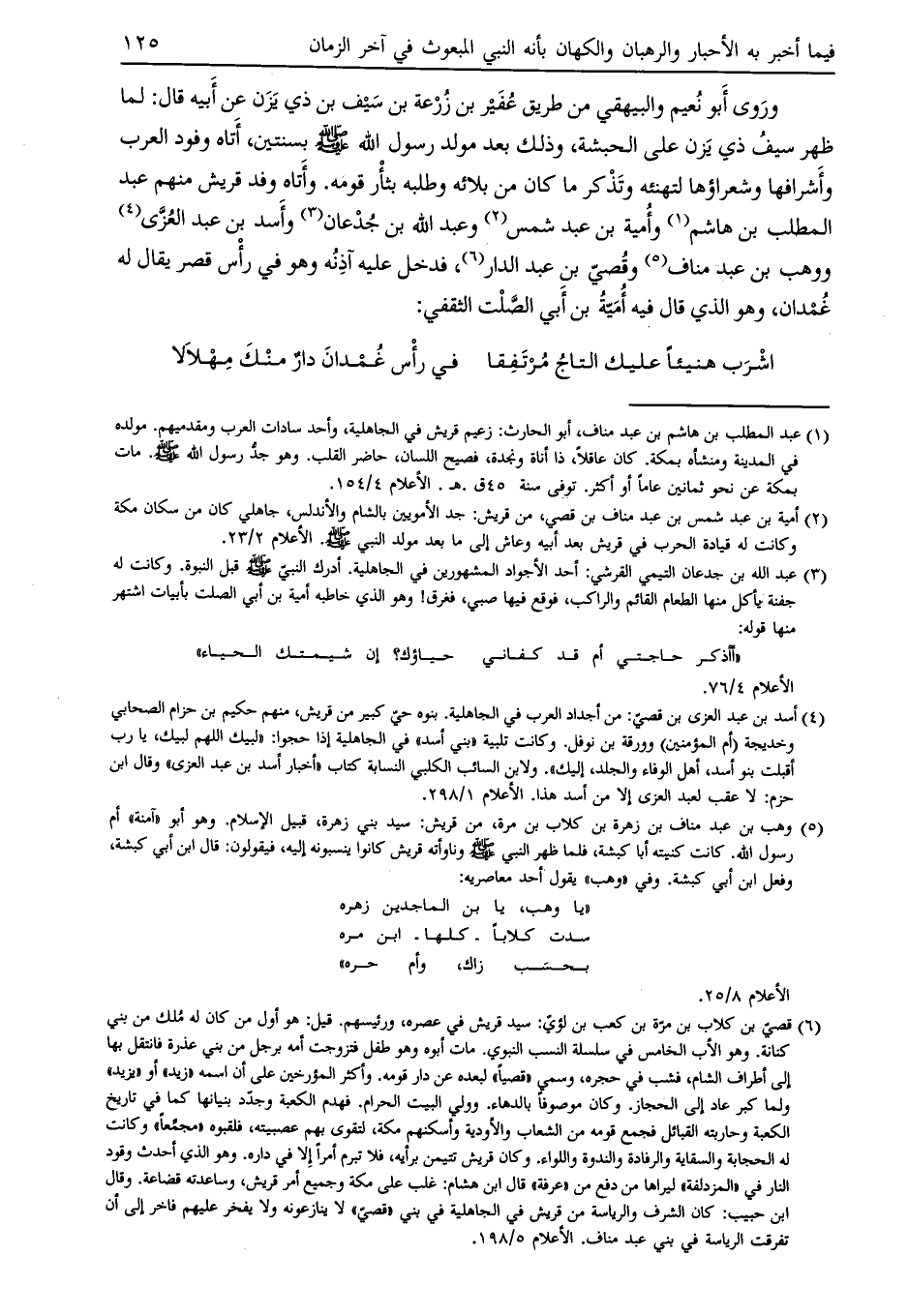 [ (1) ] عبد المطلب بن هاشم بن عبد مناف، أبو الحارث: زعيم قريش في الجاهلية، وأحد سادات العرب ومقدميهم. مولده في المدينة ومنشأه بمكة. كان عاقلا، ذا أناة ونجدة، فصيح اللسان، حاضر القلب. وهو جدّ رسول الله صلى الله عليه وسلم. مات بمكة عن نحو ثمانين عاما أو أكثر. توفي سنة 45 ق. هـ. الأعلام 4/ 154.