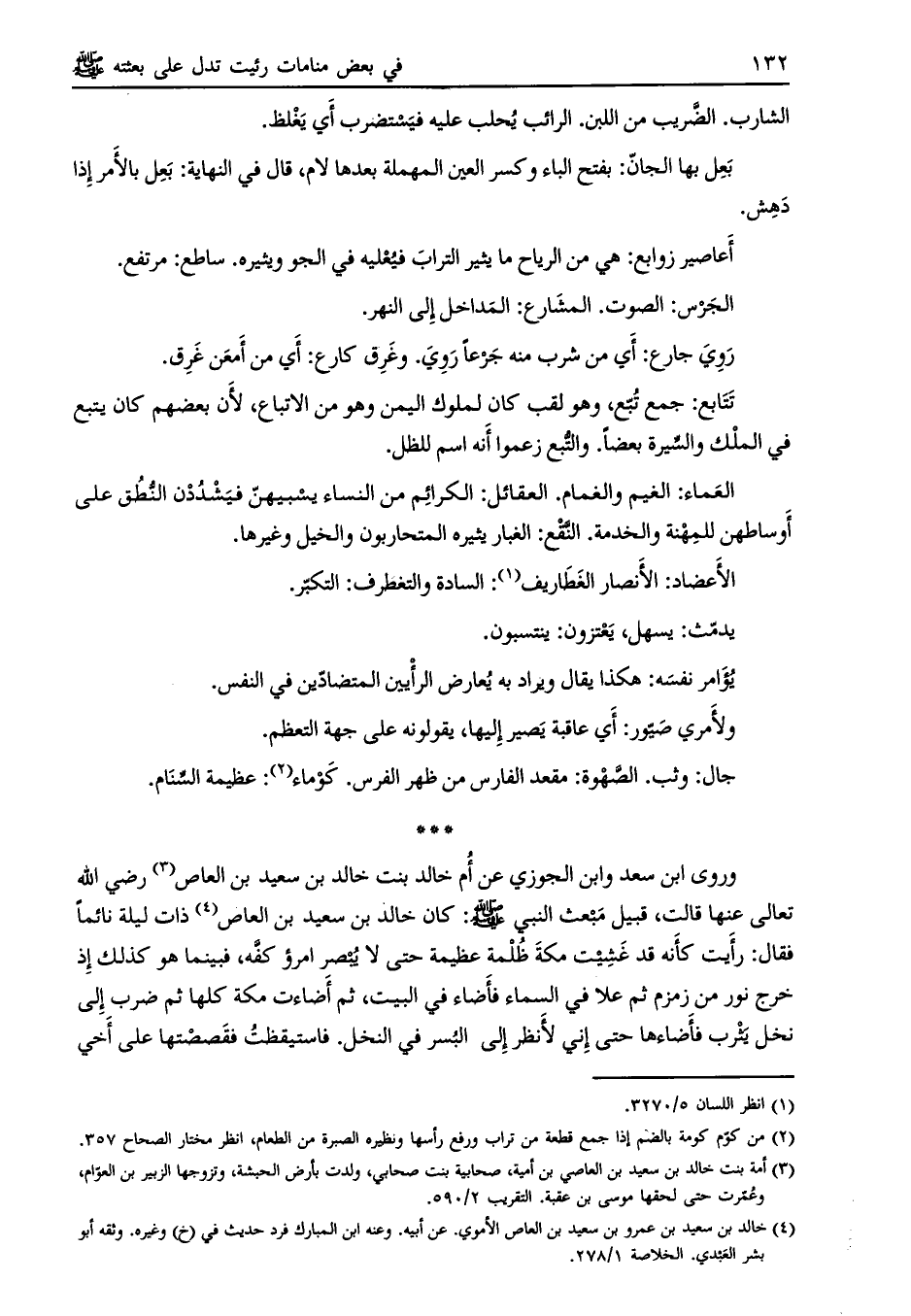 وروى ابن سعد وابن الجوزي عن أم خالد بنت خالد بن سعيد بن العاص [ (3) ] رضي الله تعالى عنها قالت، قبيل مبعث النبي صلى الله عليه وسلم: كان خالد بن سعيد بن العاص [ (4) ] ذات ليلة نائماً فقال: رأيت كأنه قد غشيت مكة ظلمة عظيمة حتى لا يبصر امرؤ كفّه، فبينما هو كذلك إذ خرج نور من زمزم ثم علا في السماء فأضاء في البيت، ثم أضاءت مكة كلها ثم ضرب إلى نخل يثرب فأضاءها حتى إني لأنظر إلى البسر في النخل. فاستيقظت فقصصتها على أخي